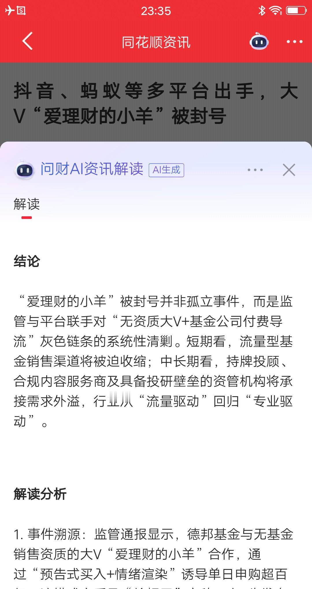 A股最惨的财经博主诞生了,拥有百万粉丝的大V“爱理财的小羊”被封号,200多万粉丝和400多万粉丝,这两个号都没了,抖音搜索已经找不到了。 被封号的原因是,没有基金销售资质,与德邦基金合作,赚取高额广告费。 “爱理财的小羊”预告式买入德邦稳盈增长基金的时间线如下: 1月11日:在蚂蚁财富平台进行转换与现金买入操作,合计308.7万元,实盘同步公开。 1月12日:公开发布实盘操作动态与视频,明确宣布调仓买入该基金,引发粉丝跟风,当日该基金申购超百亿 。 上百亿呀,要知道大A百亿市值的基金,也没有多少呀。不得不说,网络大V的影响力真大呀。