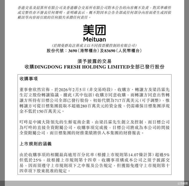 据了解,叮咚买菜海外业务不在本次交易范围内,交易过渡期内,叮咚买菜将按照交易前的模式继续经营。叮咚买菜创始人梁昌霖在2月5日发布的内部信中表示,叮咚买菜的业务和团队会保持稳定。