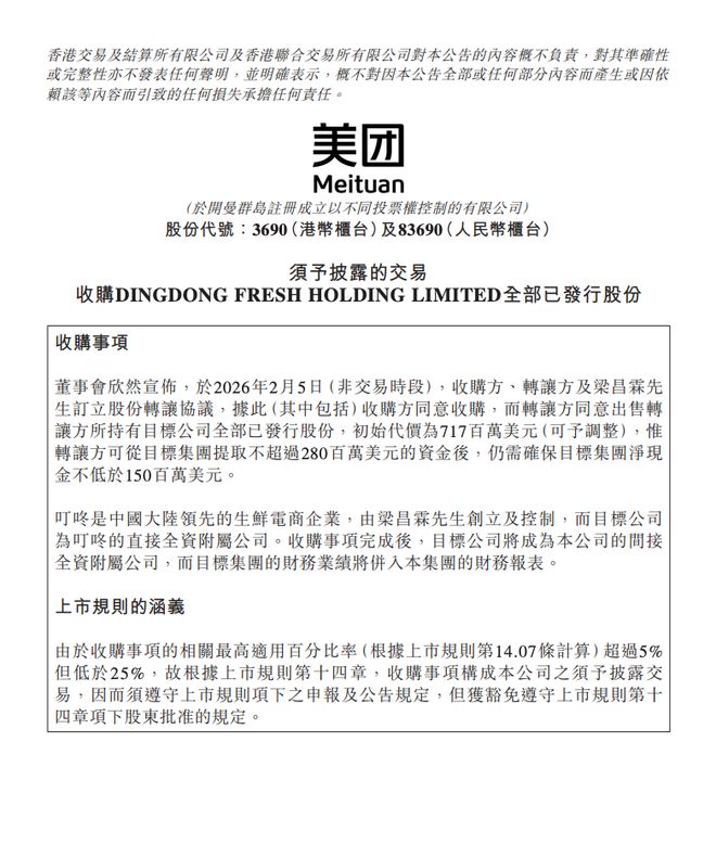 美团宣布将用7.17亿美元,全资收购叮咚买菜的国内业务。