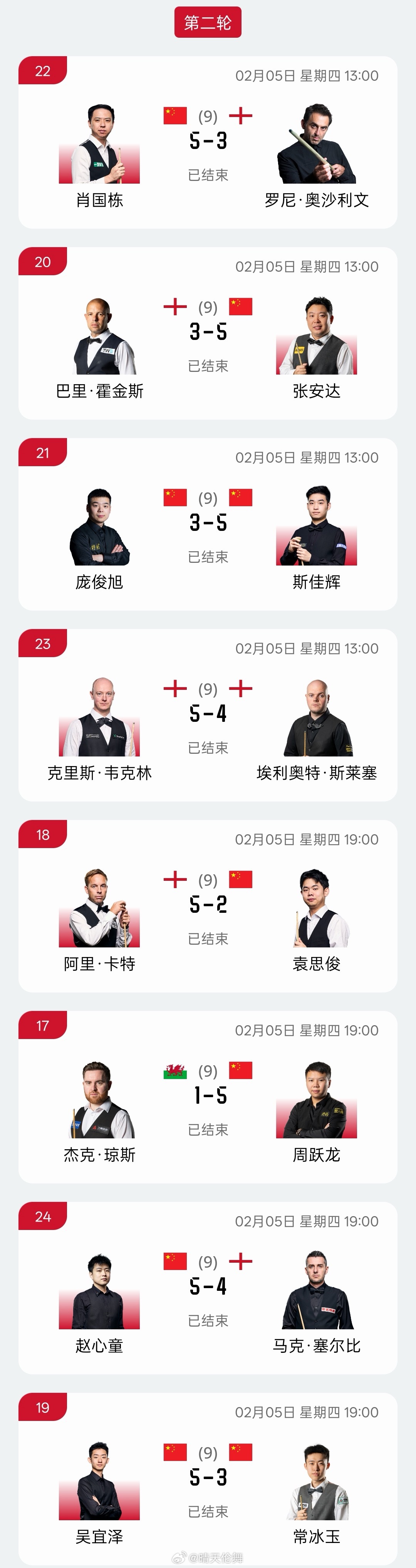 2026斯诺克世界大奖赛 第二轮(9局5胜)🇨🇳肖国栋 5-3 🏴罗尼·奥沙利文🇨🇳斯佳辉 5-3 🇨🇳庞俊旭🇨🇳张安达 5-3 🏴巴里·霍金斯🇨🇳赵心童 5-4 🏴马克·塞尔比🇨🇳吴宜泽 5-3 🇨🇳常冰玉🇨🇳周跃龙 5-1 🏴杰克·琼斯🇨🇳袁思俊 2-5 🏴阿里·卡特赵心童5比4逆转塞尔比赵心童连胜4局逆转八强对阵:🇨🇳周跃龙 vs 🏴阿里·卡特🇨🇳吴宜泽 vs 🇨🇳张安达🇨🇳斯佳辉 vs 🇨🇳肖国栋🇨🇳赵心童 vs 🏴克里斯·韦克林