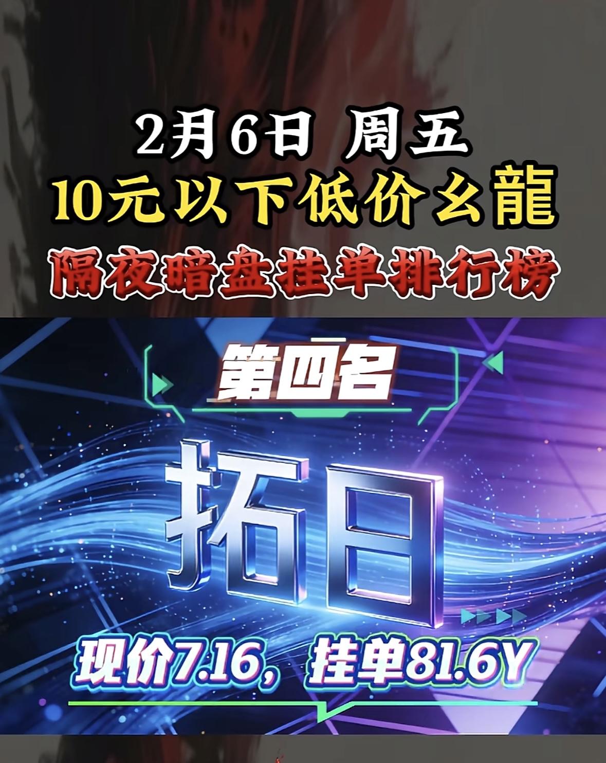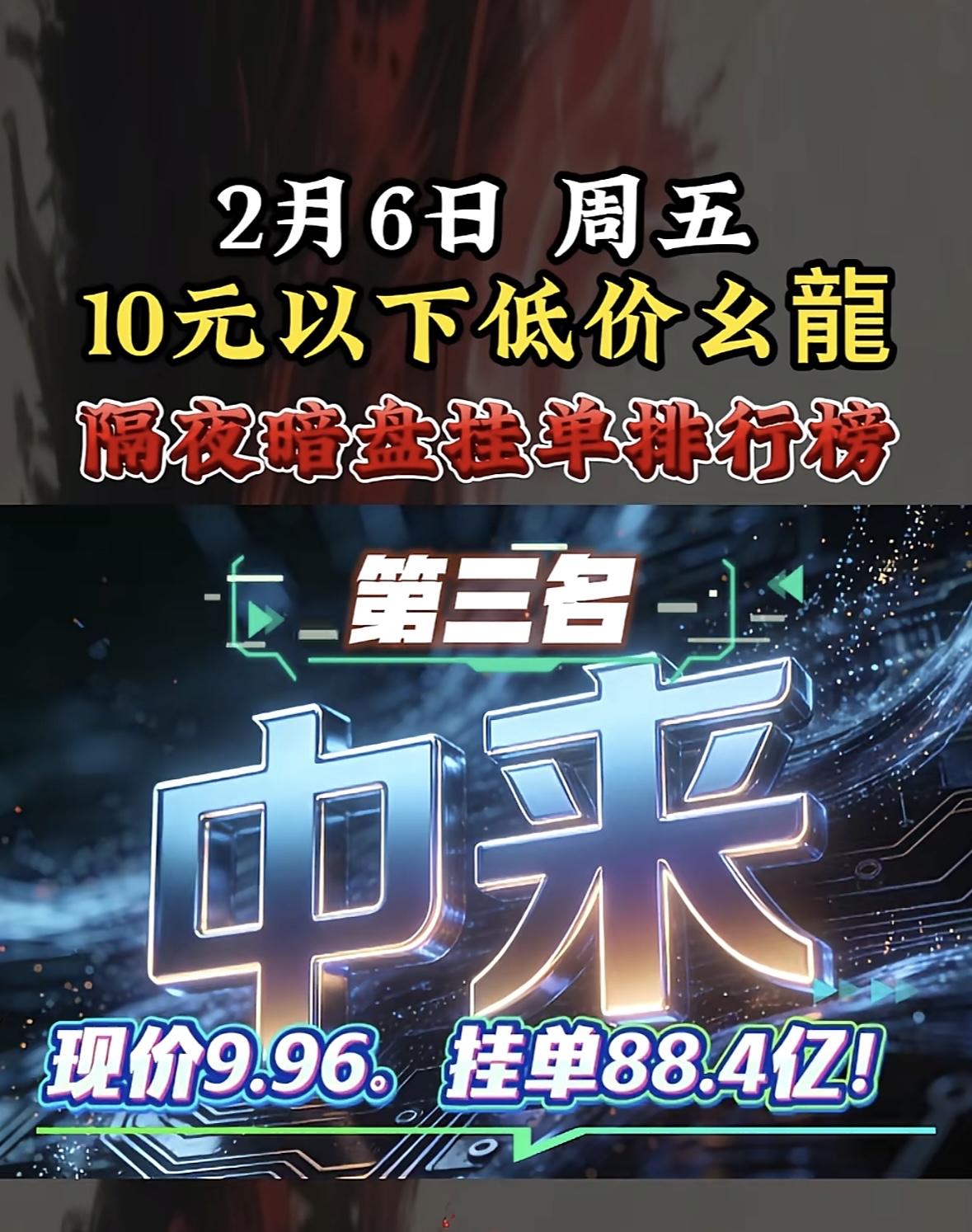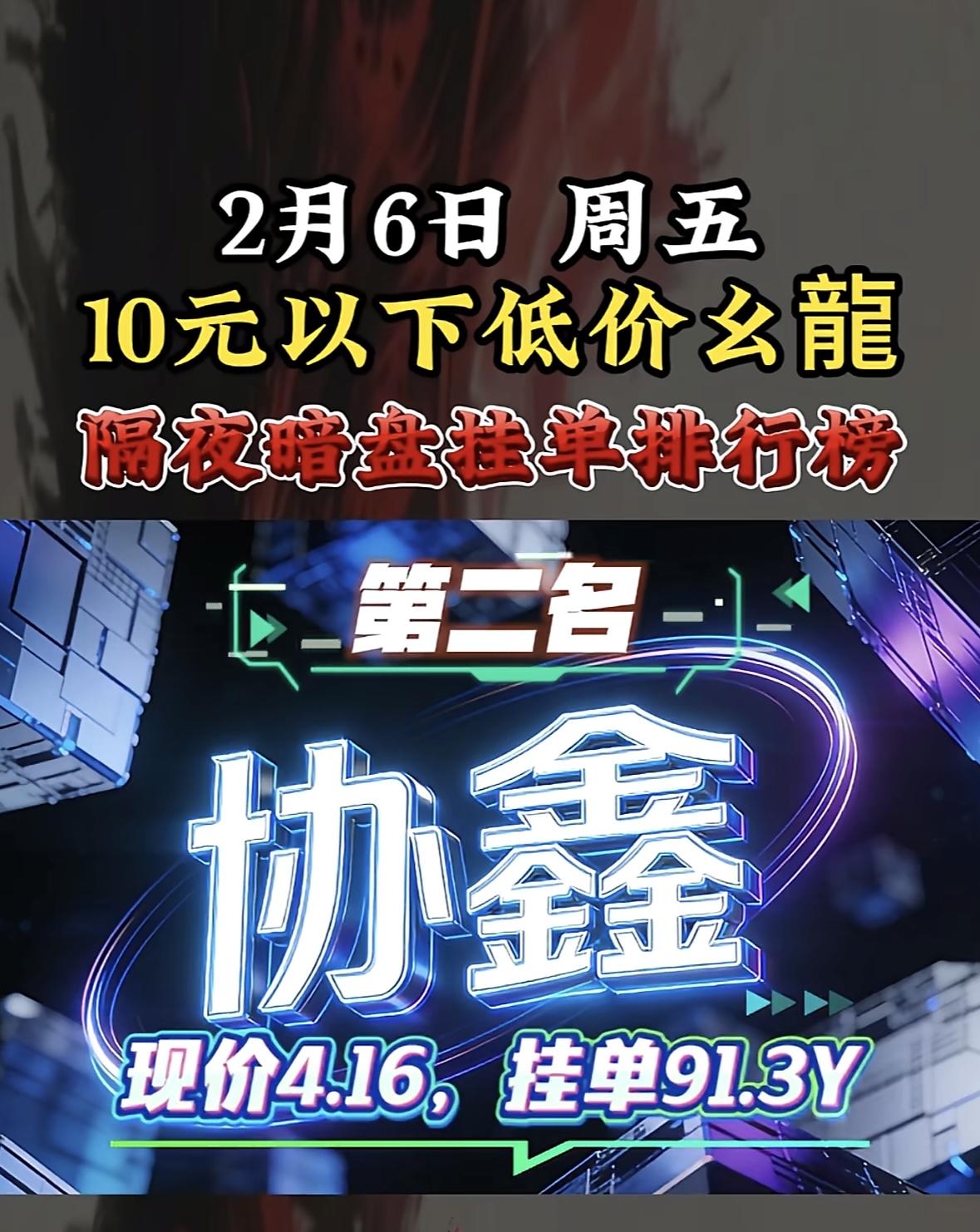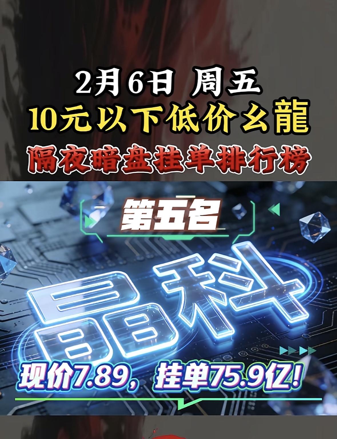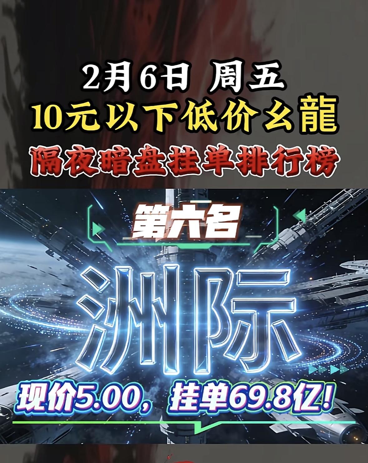 2月6日周五暗盘隔夜挂单,10元以下低价好物推荐,隔夜暗盘挂单排行榜! 低价股暗盘抢筹火爆,资金疯狂涌入某标的,现价低廉引巨量挂单,市场热度飙升凸显资本博弈信号。