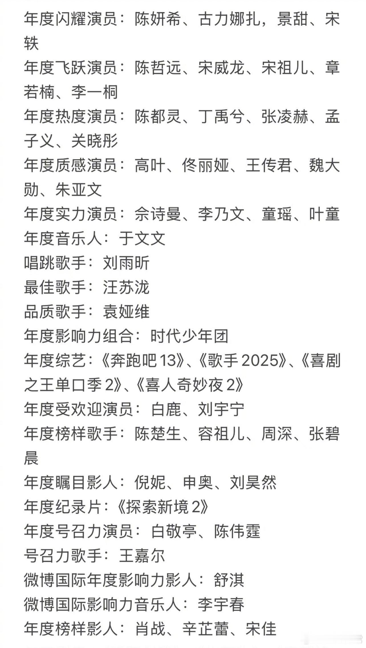 微博之夜获奖名单