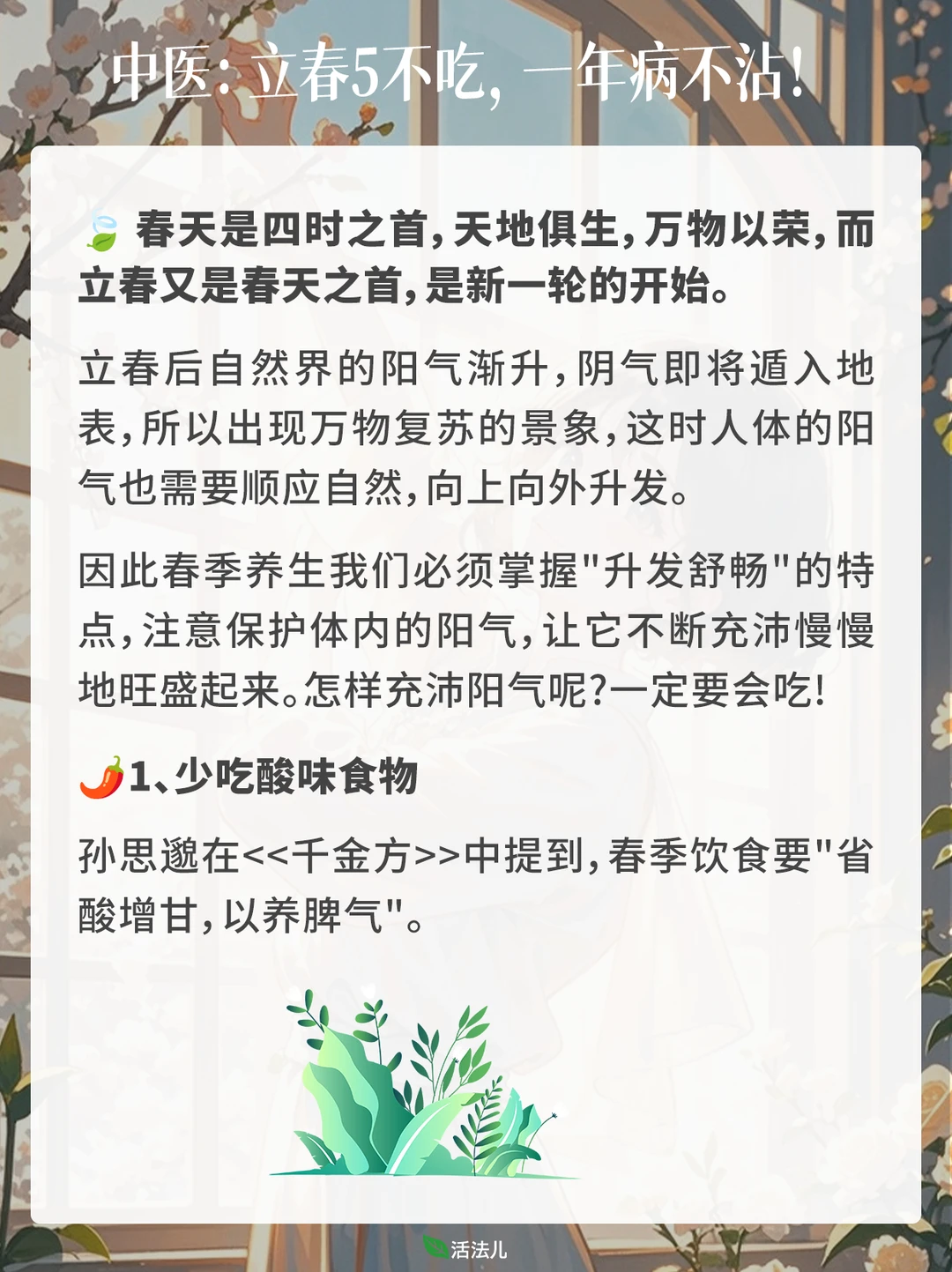 春天是四时之首,天地俱生,万物以荣,而立春又是春天之首,是新一轮的开始。立春后自然界的阳气渐升,阴气即将遁入地表,所以出现万物复苏的景象,这时人体的阳气也需要顺应自然,向上向外升发。 因此春季养生我们必须掌握"升发舒畅"的特点,注意保护体内的阳气,让它不断充沛慢慢地旺盛起来。怎样充沛阳气呢?一定要会吃!