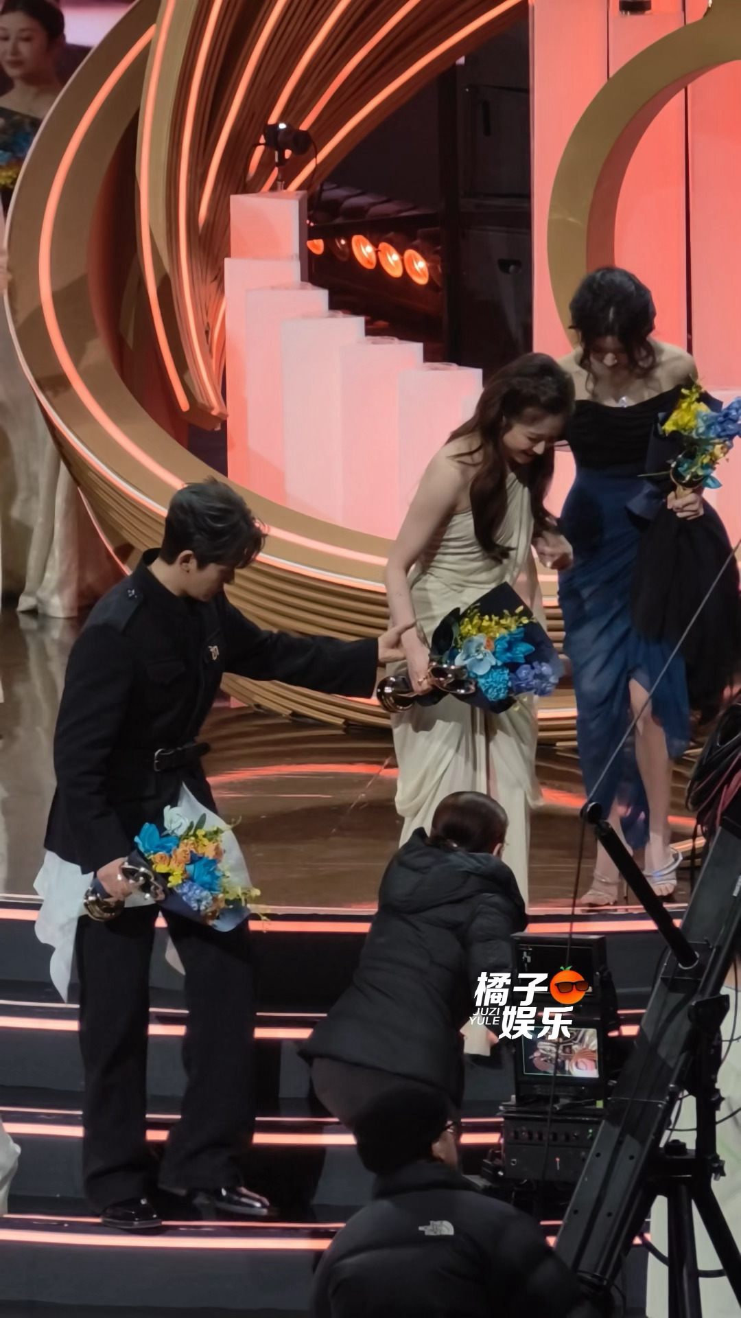 晓晓先伸手扶了一段,然后邓为追上来俩人一起扶兰迪下了台阶邓为卢昱晓都在扶李兰迪邓为卢昱晓一起扶李兰迪 我拍的星现场