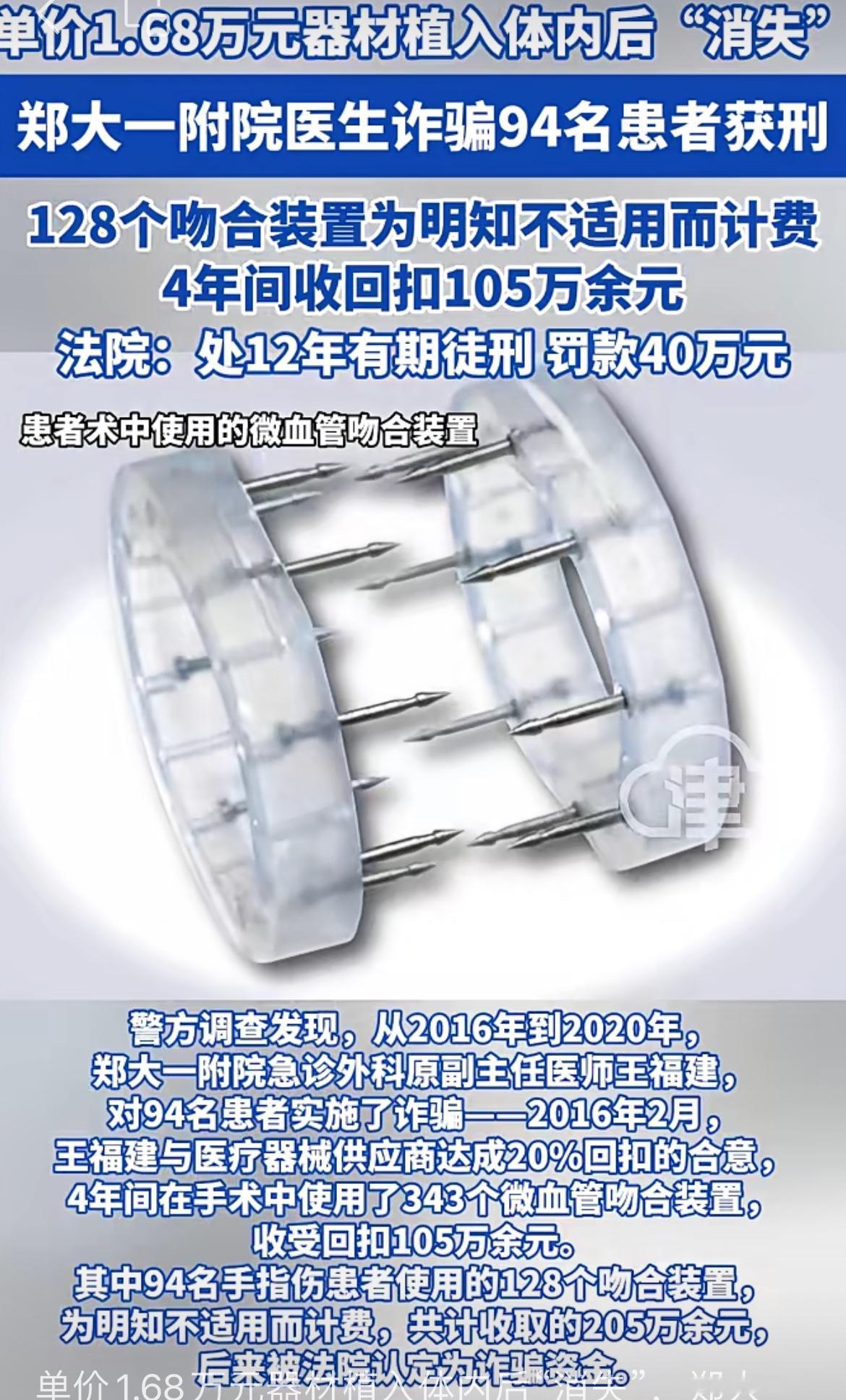 郑大一附院的王福建作为医生的手术操作简直让人后背发凉,94名患者,消耗343个微血管吻合器,每个16800元,为了成功卖给患者,不惜铤而走险把吻合器埋在患者肌肉里。回扣105万,诈骗205万,这人是拿着手术刀的魔鬼。更加离谱的是,王福建一直被患者投诉,被新闻媒体深度曝光,却仅仅是被停职,之后又在医院其他院区复出,就这样依然不收敛,最后还能安稳退休。吻合器套管 血管吻合术