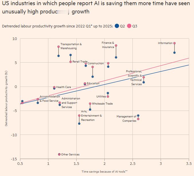 真正值得关注的是行业层面的相关性。如果AI确实能帮助企业提升人均产出,那么那些最积极采用AI的行业,应当展现出最强的劳动生产率增长。数据显示,在美国,这种相关性已经开始显现。
