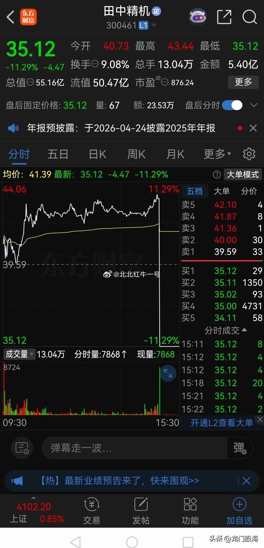 不得不佩服田中精机的操盘手法!昨日尾盘最后几秒直线砸跌20%,这种极致跌停绝非散户能为,妥妥是机构主力的刻意操作;今日更甚,开盘直接拉涨20%封板,同样的强势拉升,散户根本不具备这样的资金和节奏把控能力。