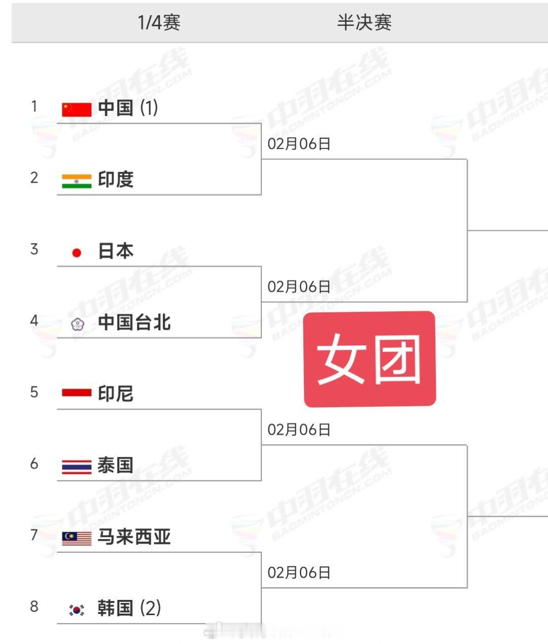 亚锦赛羽毛球👧🏻女团❽强排位及淘汰赛分组出炉W:中国🇨🇳(小组第一)、马