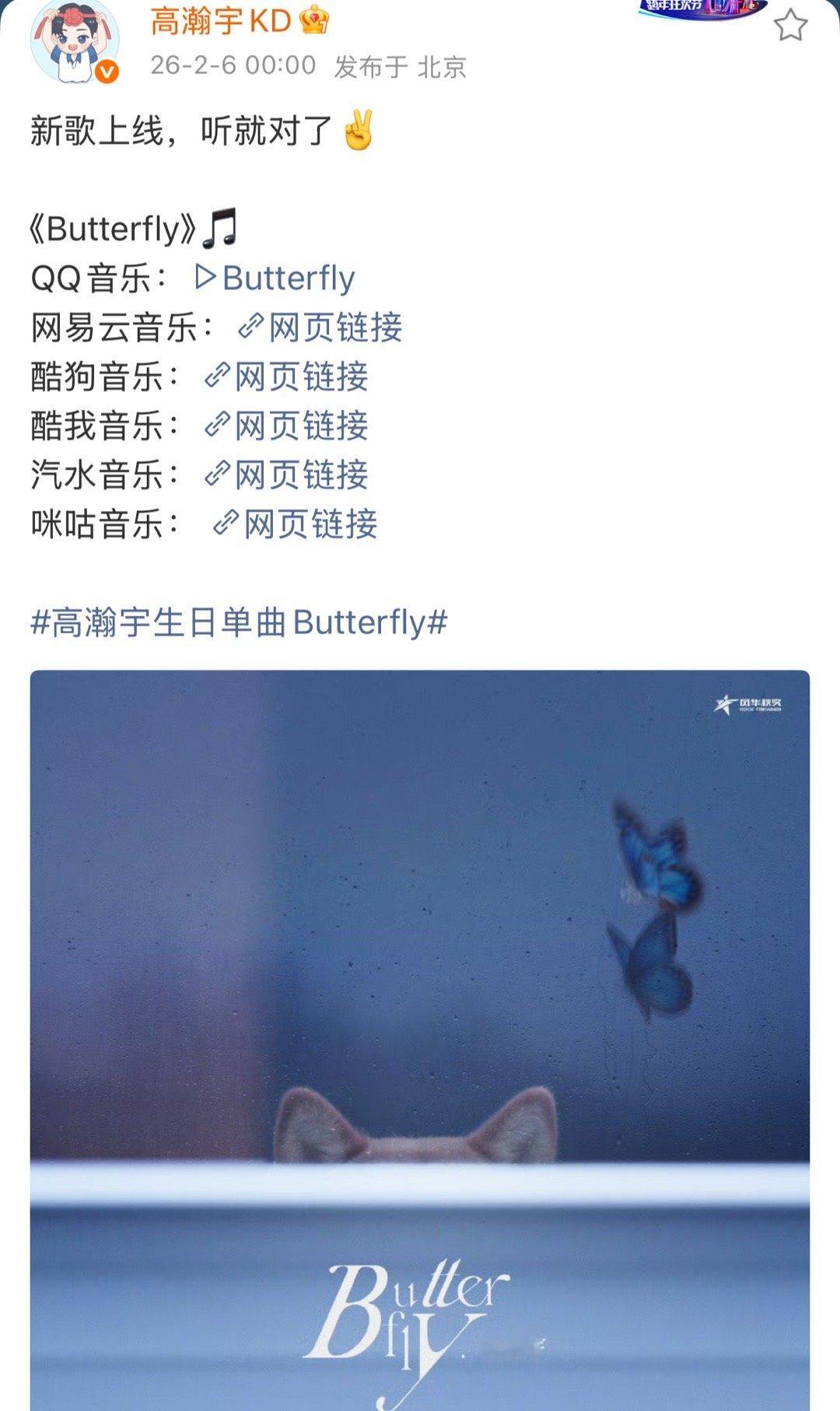 高瀚宇Butterfly上线高瀚宇生日单曲Butterfly年度治愈单曲已就位!高瀚宇用温柔唱腔诠释“想留却留不住”的细腻心绪,鹿晗第一时间上线应援,神仙兄弟情+走心单曲,双份美好来袭!