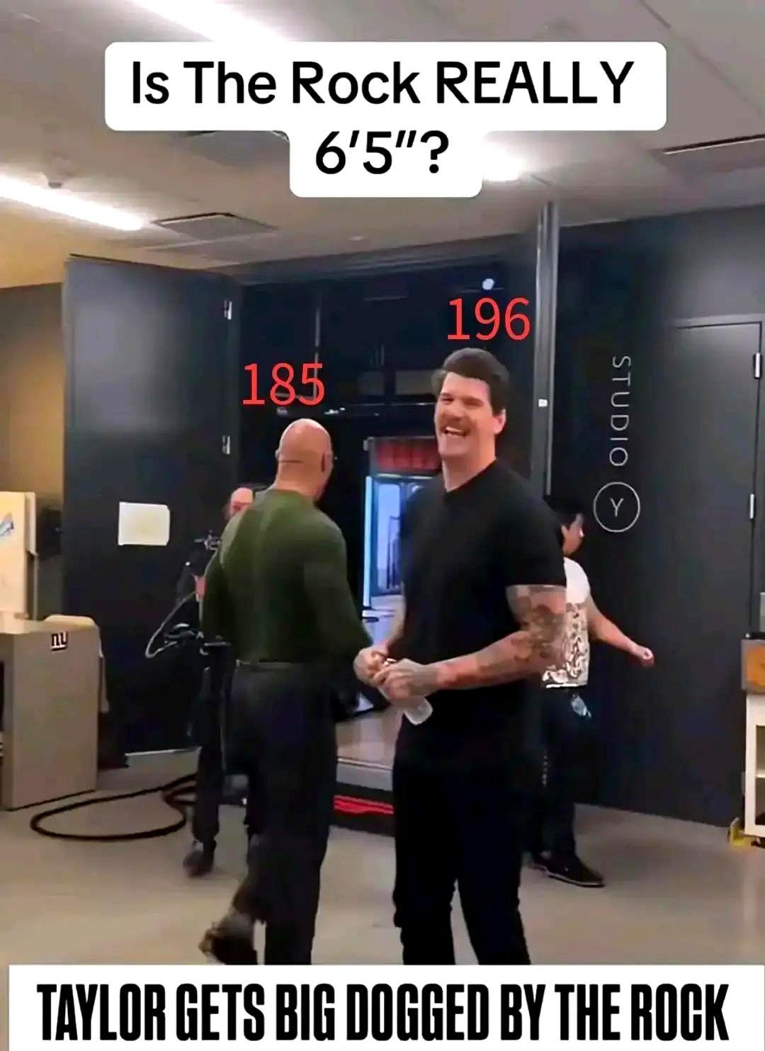 巨石强森1米96的身高,骗了我们整整20年。 银幕上,他是一堵两米高的人墙,一拳砸穿地心。直到他跟1米96的巴克利站在一起,气场瞬间被压制,整个人缩水了一圈。 翻开他的老底,WWE时期登记身高1米96。这数字,纯粹是摔角圈的门面,谁当真谁就输了。 那你在电影里看到的巨人是怎么回事?很简单,踩着特制增高战靴,用仰拍镜头对着你,再找几个矮个子演员当背景板。 他的身高,他的肌肉,他的硬汉人设,都不是他自己,而是一件标价上亿的商品。你以为你在崇拜一个英雄,其实你只是在消费一个产品。 我们迷恋的,是那个银幕上的符号,而不是那个脱下增高鞋的男人。