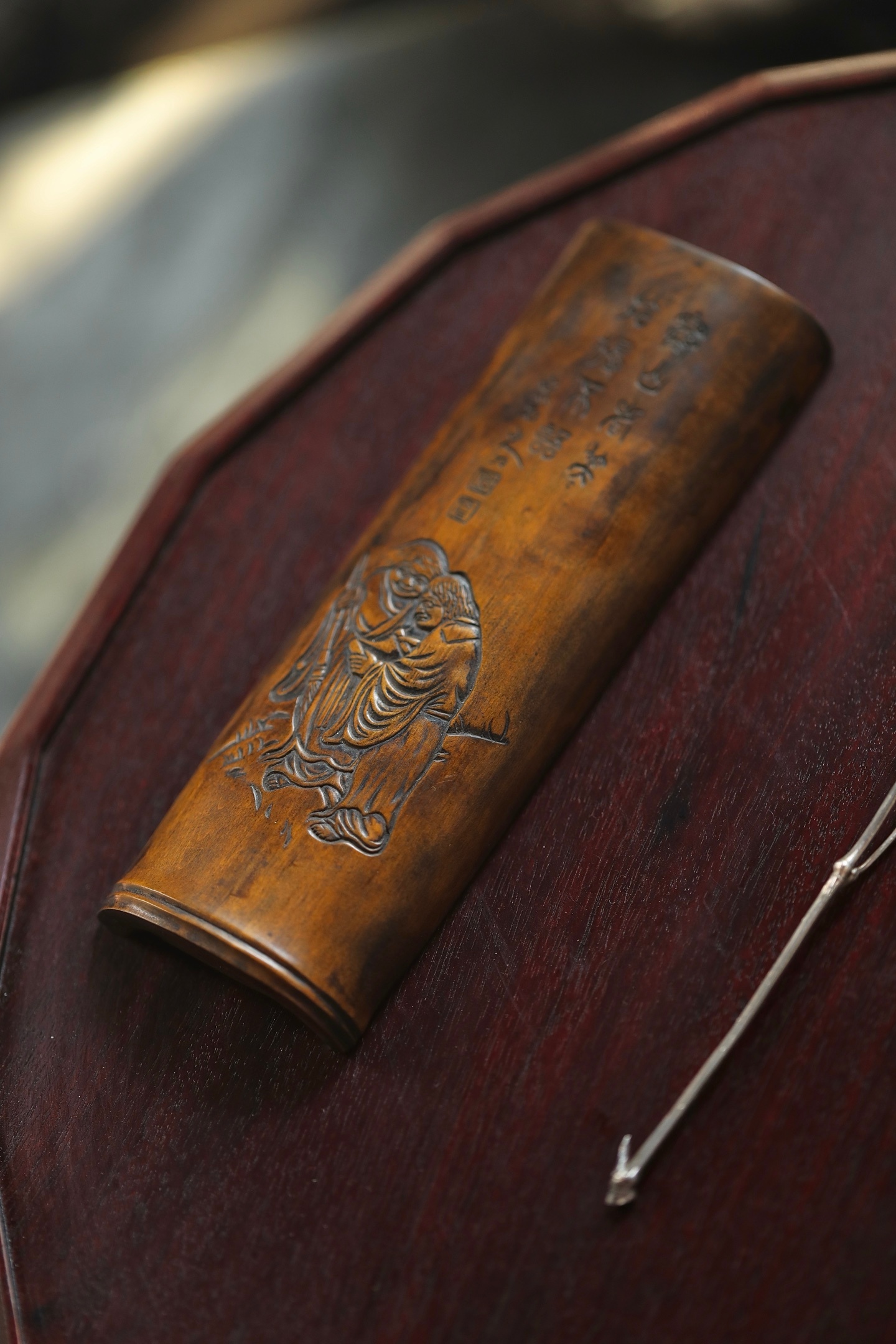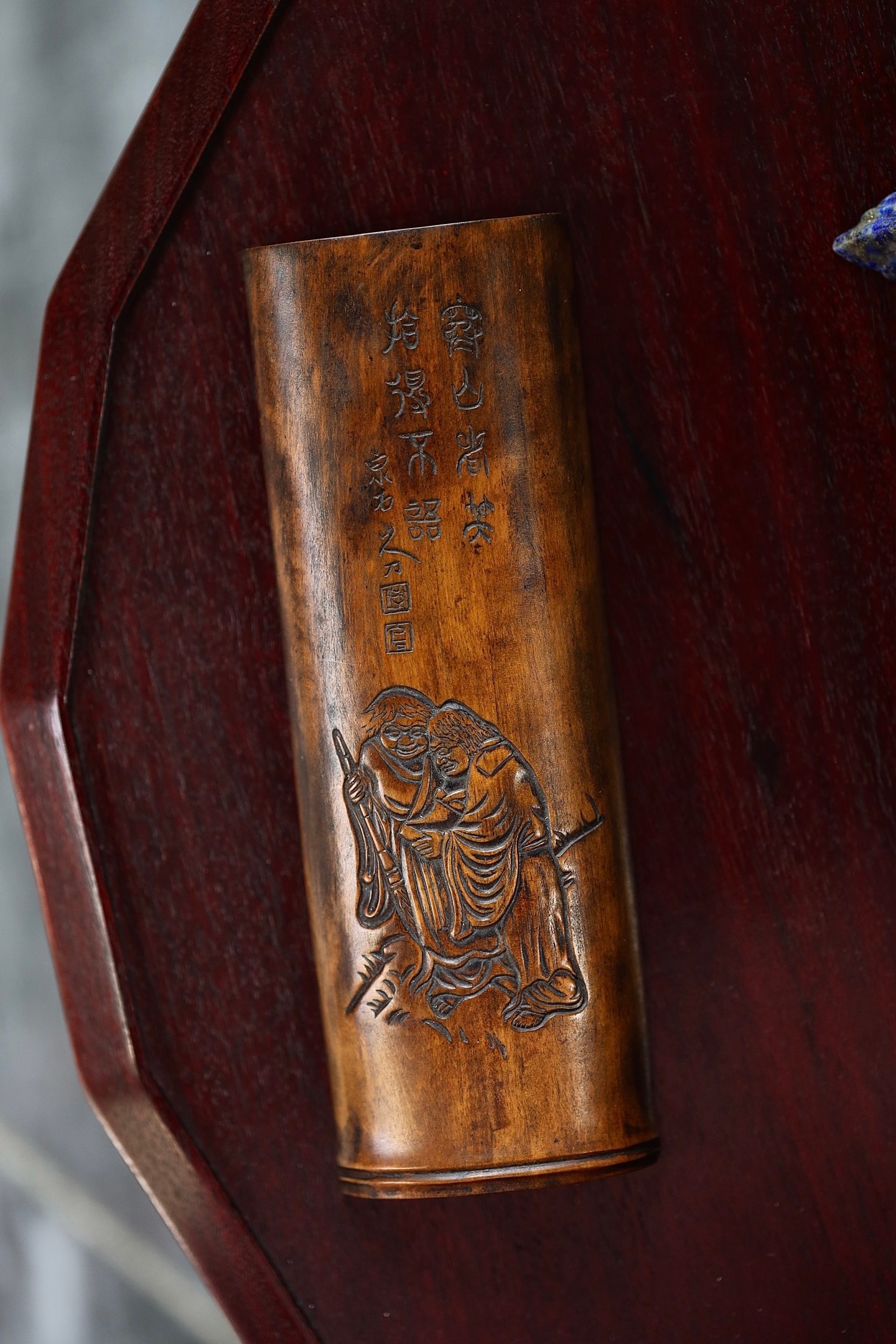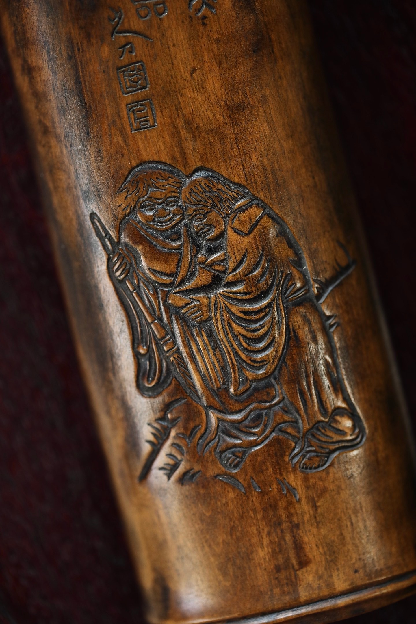茶则依竹之天然形态雕琢,二仙相携而笑,诗文题刻清雅,每一处刀痕都藏着和合意趣。闲时取茶,指尖抚过木痕,似能闻得茶香与禅意,是茶人雅士茶席不可或缺的雅玩,亦是藏于日常的和合意。