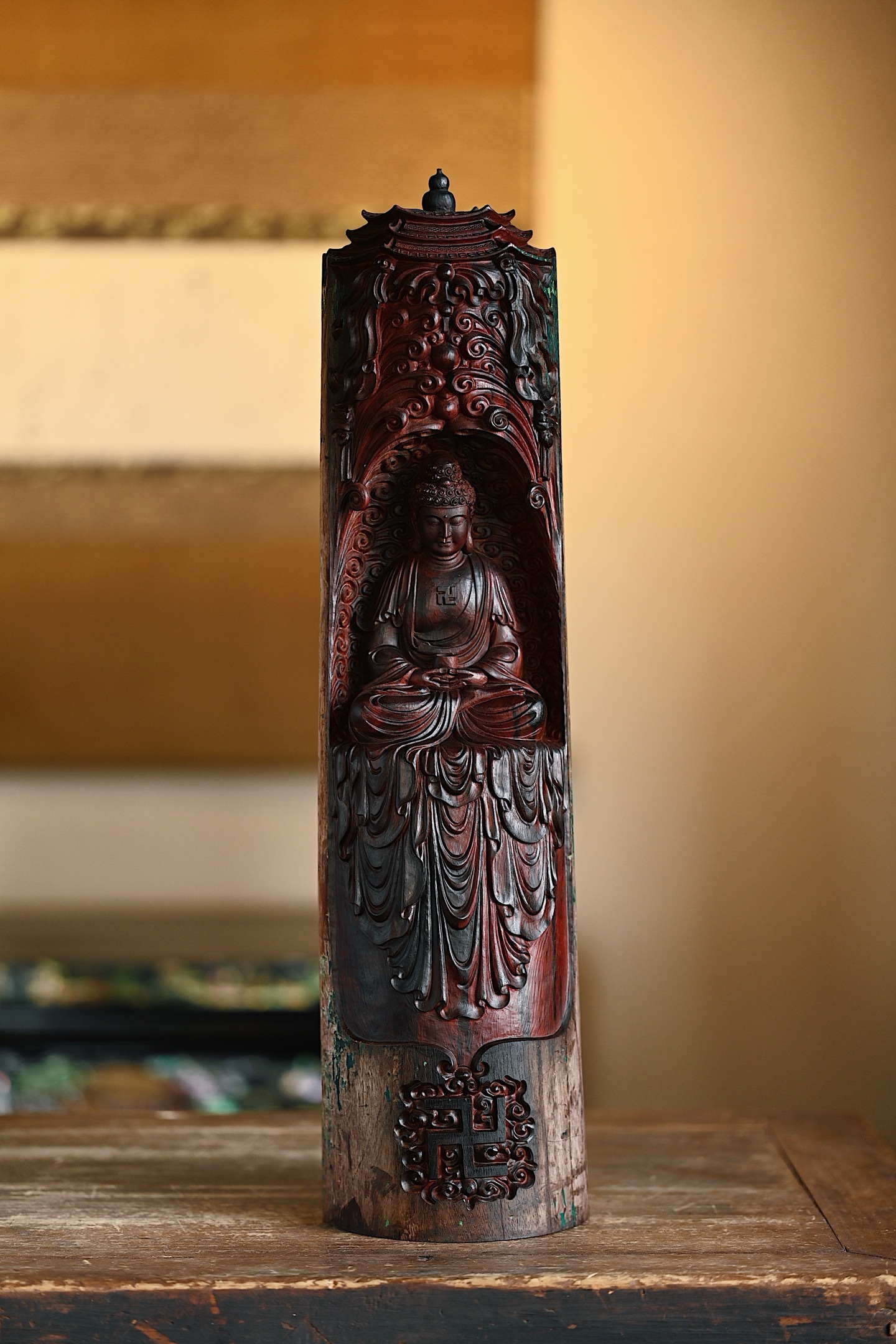 选材拆房老料,皮壳细腻,雕刻生动,释迦牟尼雍容大度,姿态优雅,目光下敛,似在俯视芸芸众生,智善合一。