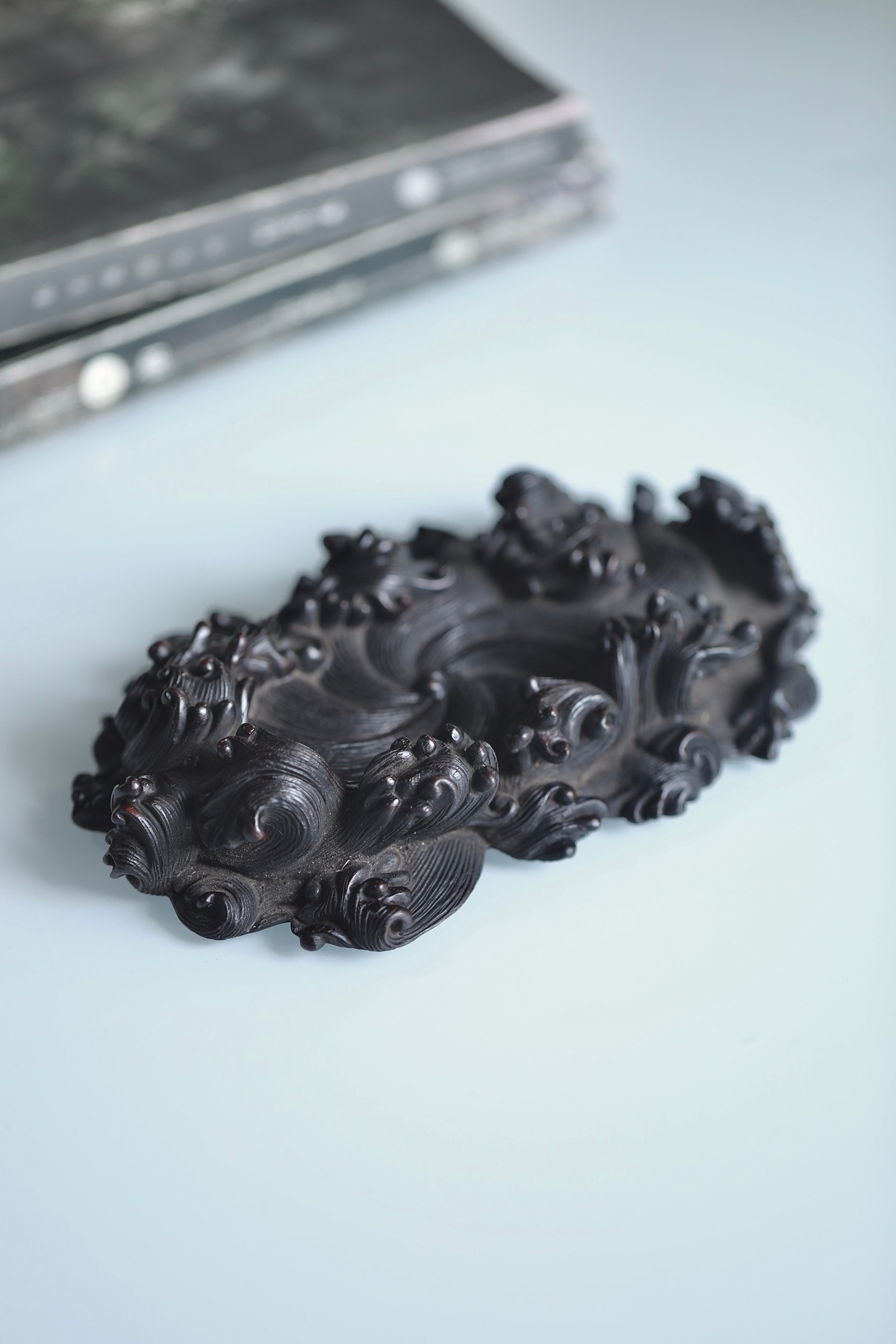 底座依木之天然形态雕琢,浪涛翻卷,浪花灵动,背面纹理如扇面舒展,每一处刀痕都藏着江海意趣,似能闻得江海潮声,是文人雅士案头不可或缺的雅玩。