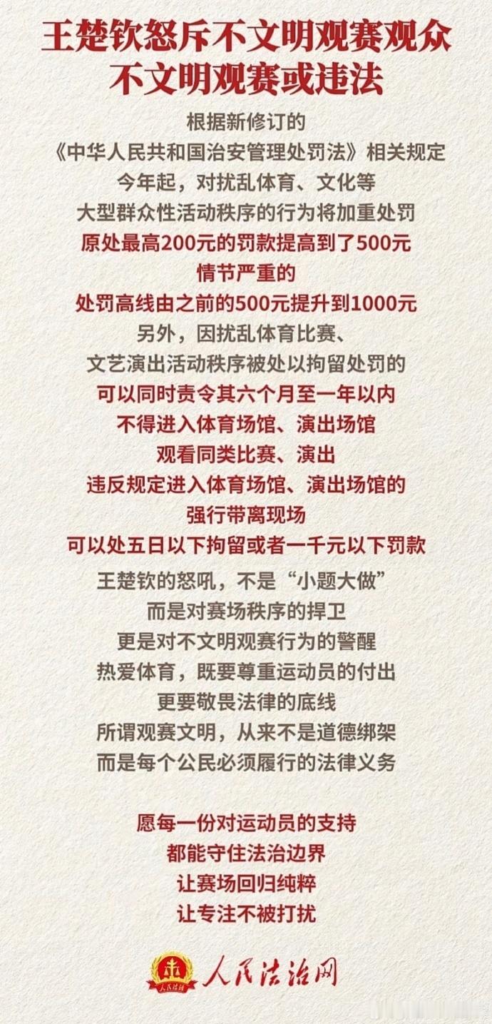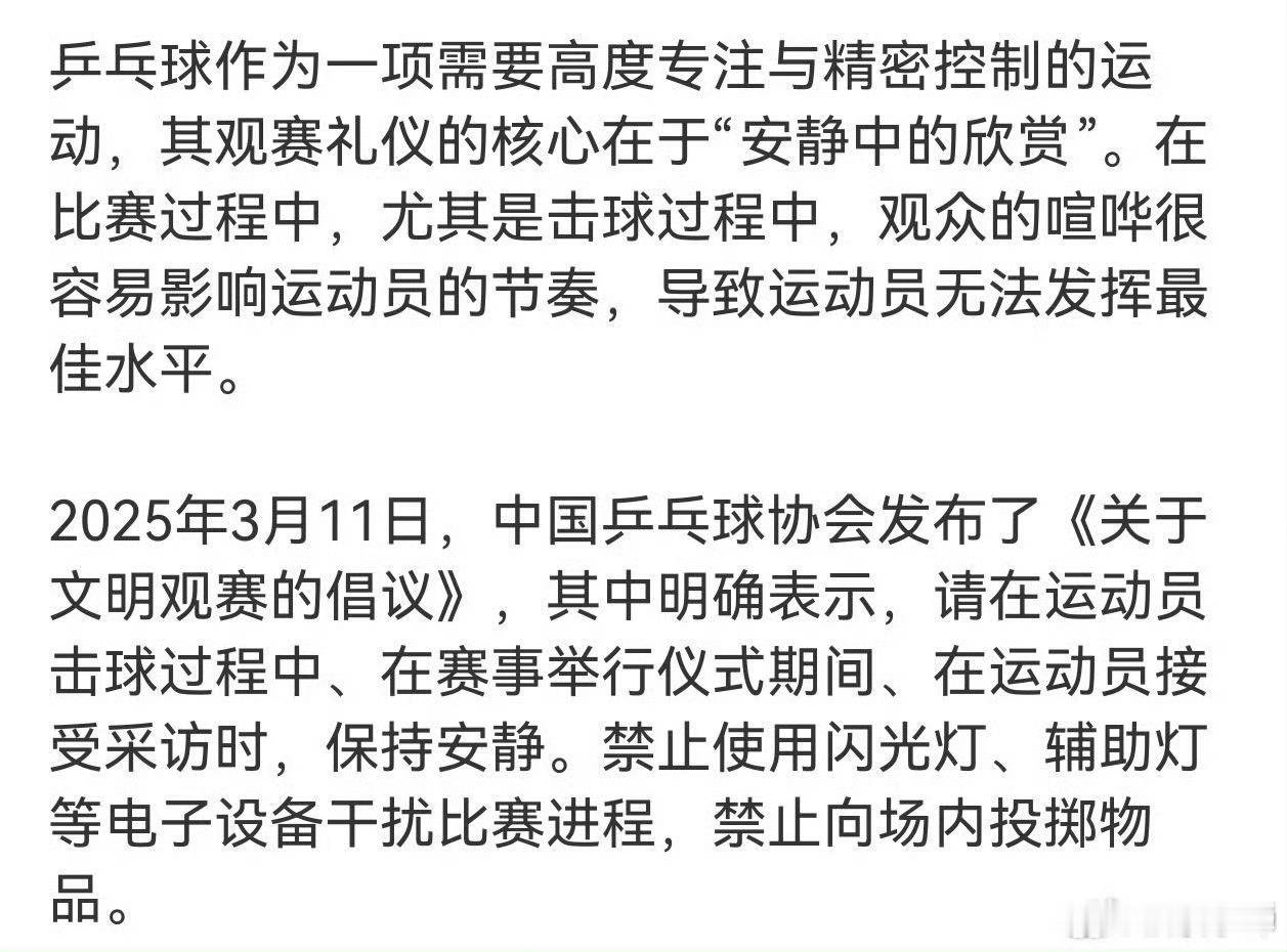 文明观赛是最基本的观赛礼仪,请尊重运动员,尊重赛场!文明观赛,从你我做起。主办方对于违规者就该立即请出去场外。不采取措施,对不遵守规则的人仁慈,就是对遵守的人残忍。王楚钦怒斥不文明观赛观众中国乒乓球队