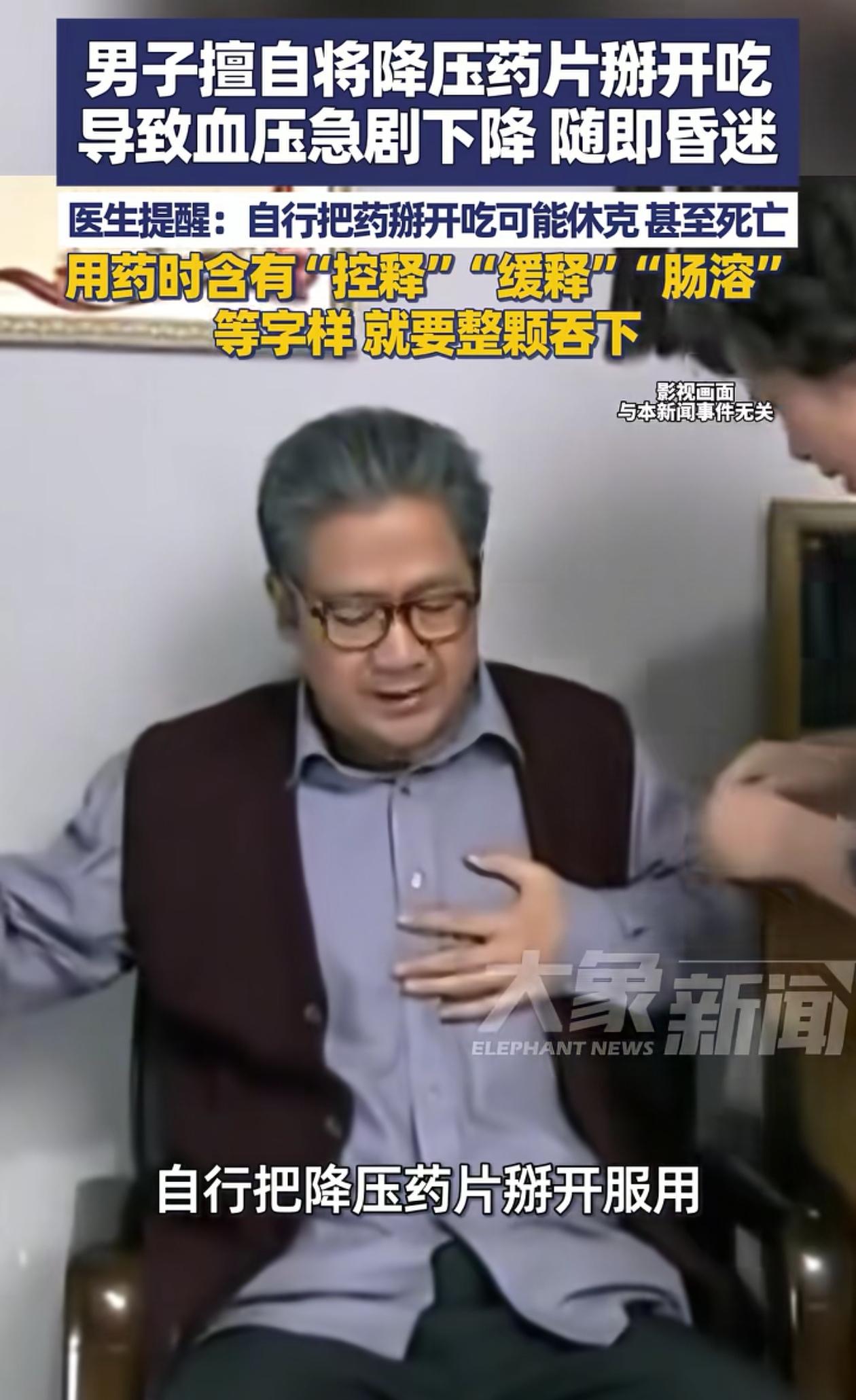 聪明反被聪明误!福建一男子吃降压药,担心吃太多对身体不好,于是把一片药掰成两半吃,没想到吃完后血压极速下降,人直接昏迷了。医生:“药不能随便掰开吃!” 吃药这件事真的别耍小聪明,一定要按医生说的做。 男子就以为这样吃量小没事,结果人直接昏迷了,还好被及时送到医院,这才捡回一条命。 事后医生一看,发现男子吃的药上面写有“缓释”、“控释”、“肠溶”等字样,急得他直拍大腿。 原来这类药外面有一层特别的“东西”,只有连着一整个吃下去,才不至于让药剂瞬间被吸收。如果掰开吃没了这层“包装”,就相当于直接跟“药物”接触,自然会导致体内含药量急速上升。 听了医生的提醒,不少网友都很惊讶,有人感叹原来不同的药吃饭还不一样,他家里人也是吃降压药,但医生开的药就可以掰开吃。也有人觉得,这么写很难让人看懂,不如写明白点,直接说明这种药不要掰开吃就好了。 说实话,不同的药有不同的吃法,这种事情也不能一概而论。我查了一下,就连同样写有“缓释”字样的药片,有些药中间有专门的“刻痕”,像这种药就可以掰开吃,但是不能嚼碎。 只是我们大多数人哪里会懂这些知识呢?说到底,吃药之前还是得跟医生问清楚该怎么吃,这样吃下去心里才会有底,也不能出事。