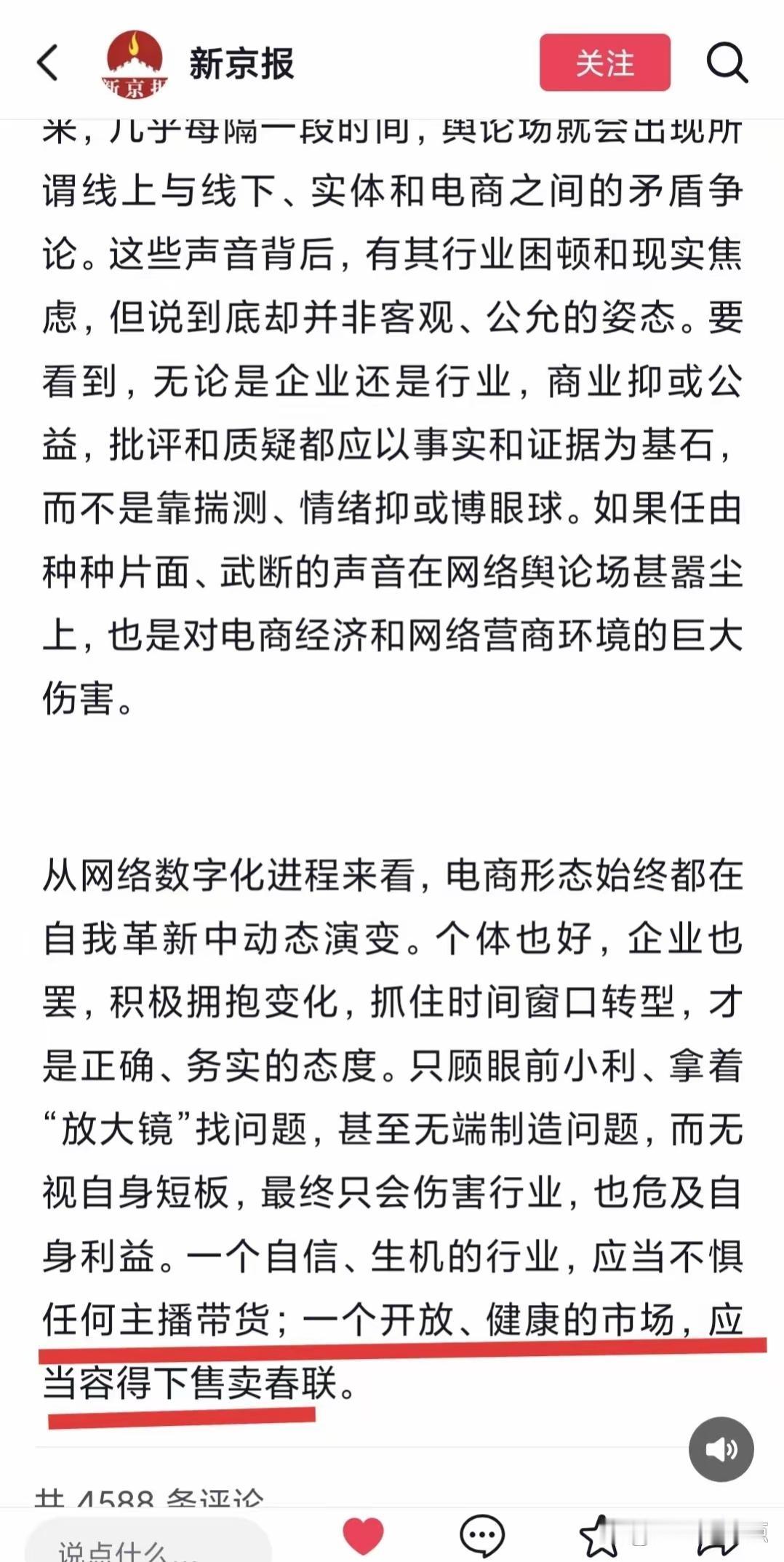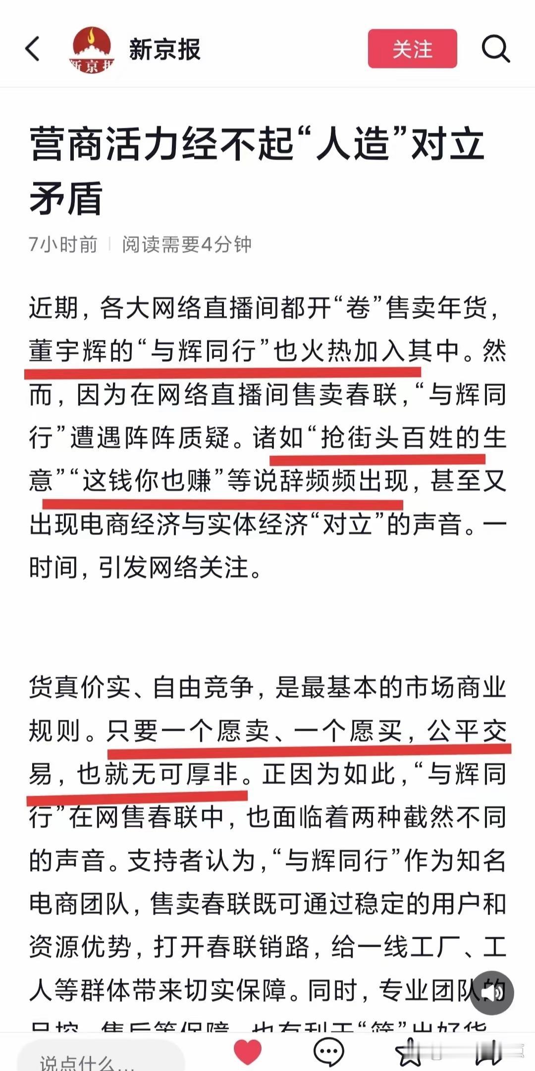 官媒这次罕见“拔刀”,替董宇辉劈出了一条清白的出口。 文章结尾那句“自信的行业,不怕任何主播;开放的市场,容得下几副春联”直接把键盘侠怼到墙边:原来锅还能这样甩? 过去一年,只要街角小店关门,就有人把账算到董宇辉头上——“他一个人直播间卷走几百亿,害得千万老板破产”。好像消费者不是用钱包投票,而是被他施了魔法。 今天《新京报》干脆把话挑明:线上再热闹,也没拦着谁线下把服务做细、把体验做出花;自己跟不上节奏,别拿头部主播当替罪羊。 货真价实、你情我愿,才是市场最朴素的底色。 董宇辉卖的是玉米、是春联,更是信任和情绪价值;顾客下单,也不是被“割韭菜”,而是为一顿精神夜宵心甘情愿扫码。 实体经济与数字屏幕从来不是零和博弈,谁先学会把流量变留量,谁就能把“倒闭潮”写成“升级记”。 所以,下次再看到空铺转租,先别急着骂主播,照照镜子,或许答案就在自己的陈列、灯光、服务和那一声“欢迎光临”里。 让买卖回归买卖,让竞争回归竞争,这才是成年人该有的江湖规矩。