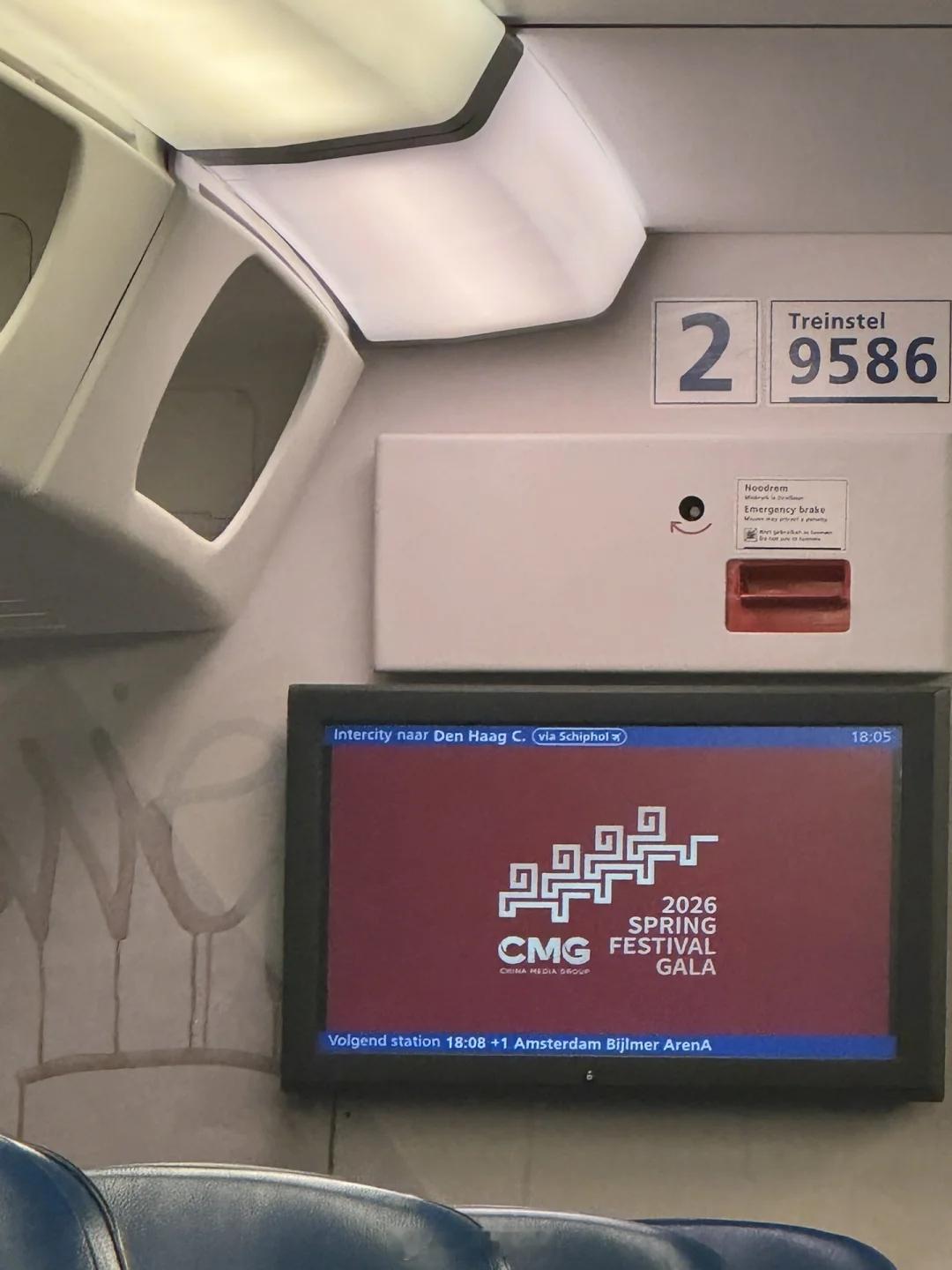 【荷兰火车播放春晚宣传片 留学生直呼亲切】近日,多名在荷兰的中国网友发帖称,在当地的火车上看到了央视春晚的宣传片,觉得十分稀奇。
