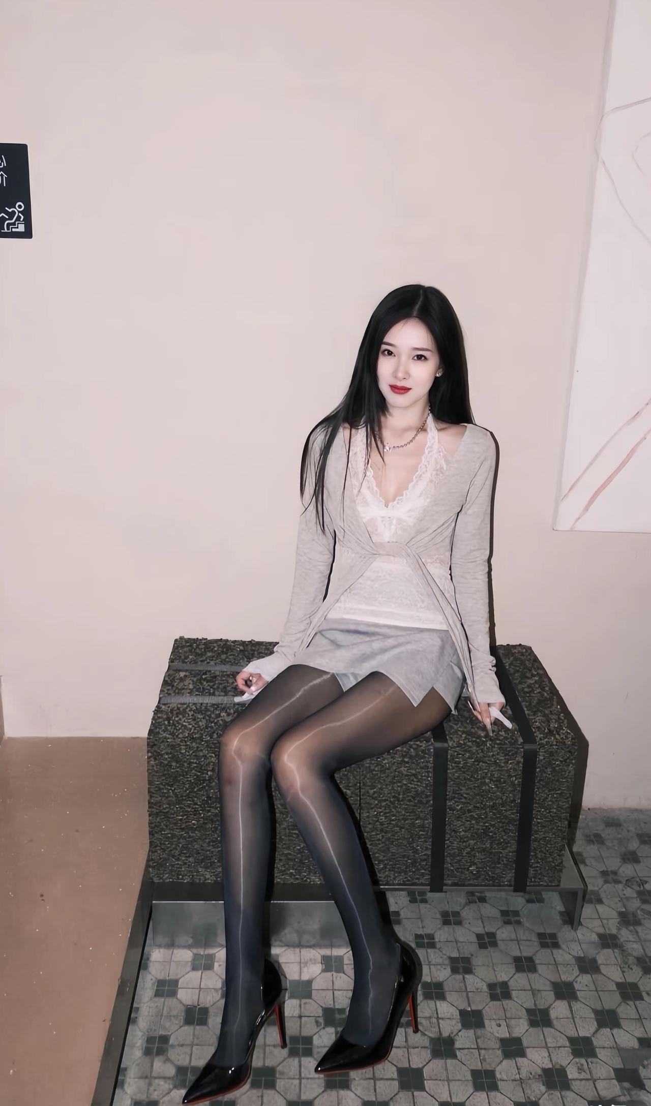 美腿辣妹,黑丝配黑色包臀连衣裙配红底黑高跟配披肩长卷黑发,简直绝了!