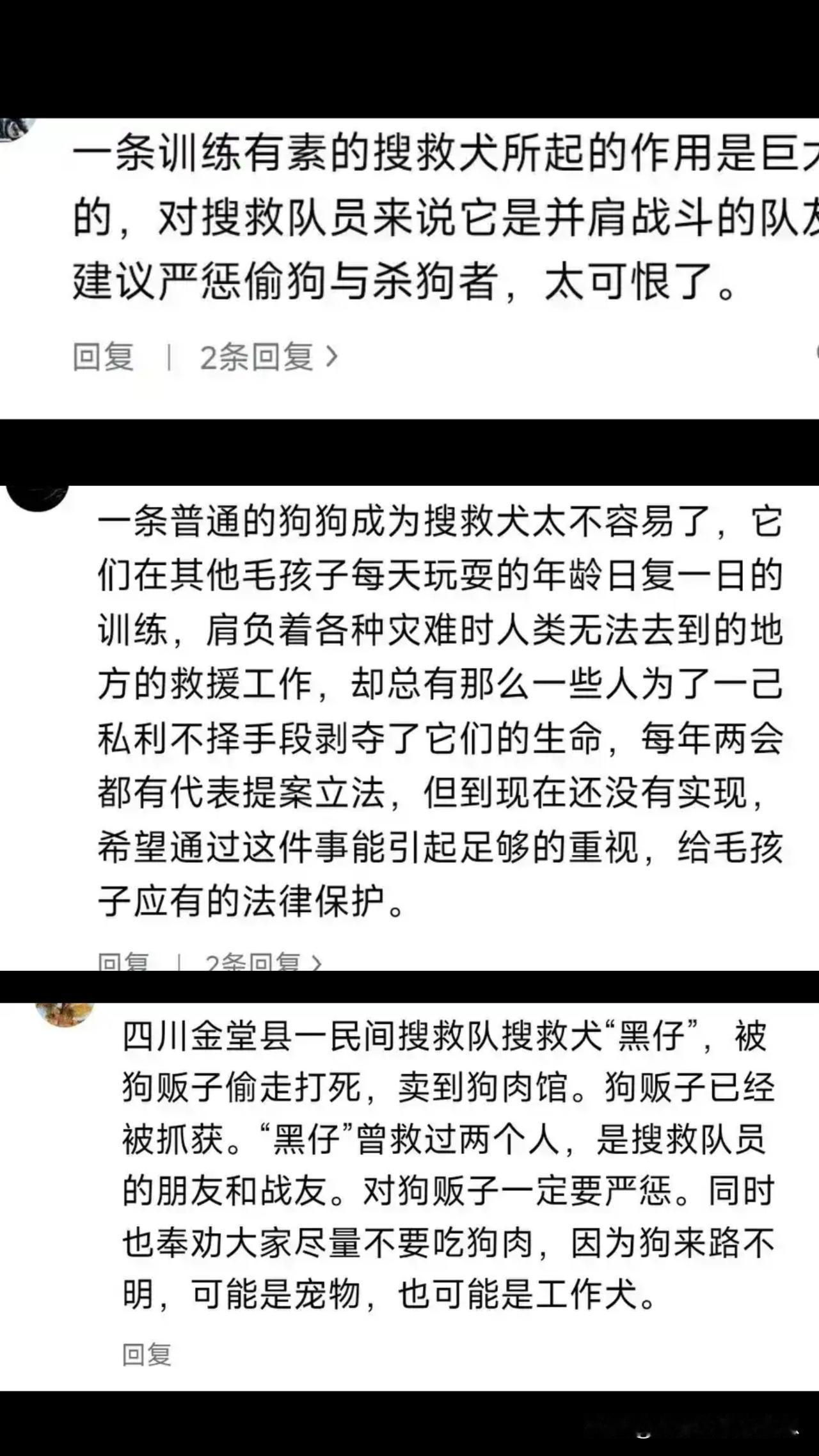 四川成都金堂县发生一起让人气愤的事😡! 原本狗狗黑崽经过训练,成为一名优秀的搜救犬。队员们为其购买了专用背心、专业牵引绳、搜救靴等设备,一年多的时间为其投入上万块钱不说,原本打算今年春节后让其接受更高级别的搜救训练。 没想到2月2日黑崽在基地外围被迷晕后偷走,队员们痛心不已。律师表示,偷工作犬行为恶劣,偷搜救犬还将涉及更严重的法律问题。 网友看到此事件也非常愤怒,希望加强对工作犬的保护,建议为搜救犬植入芯片等。黑崽本就不幸,可它的新生命才开始,就被那些偷狗者无情地结束了。