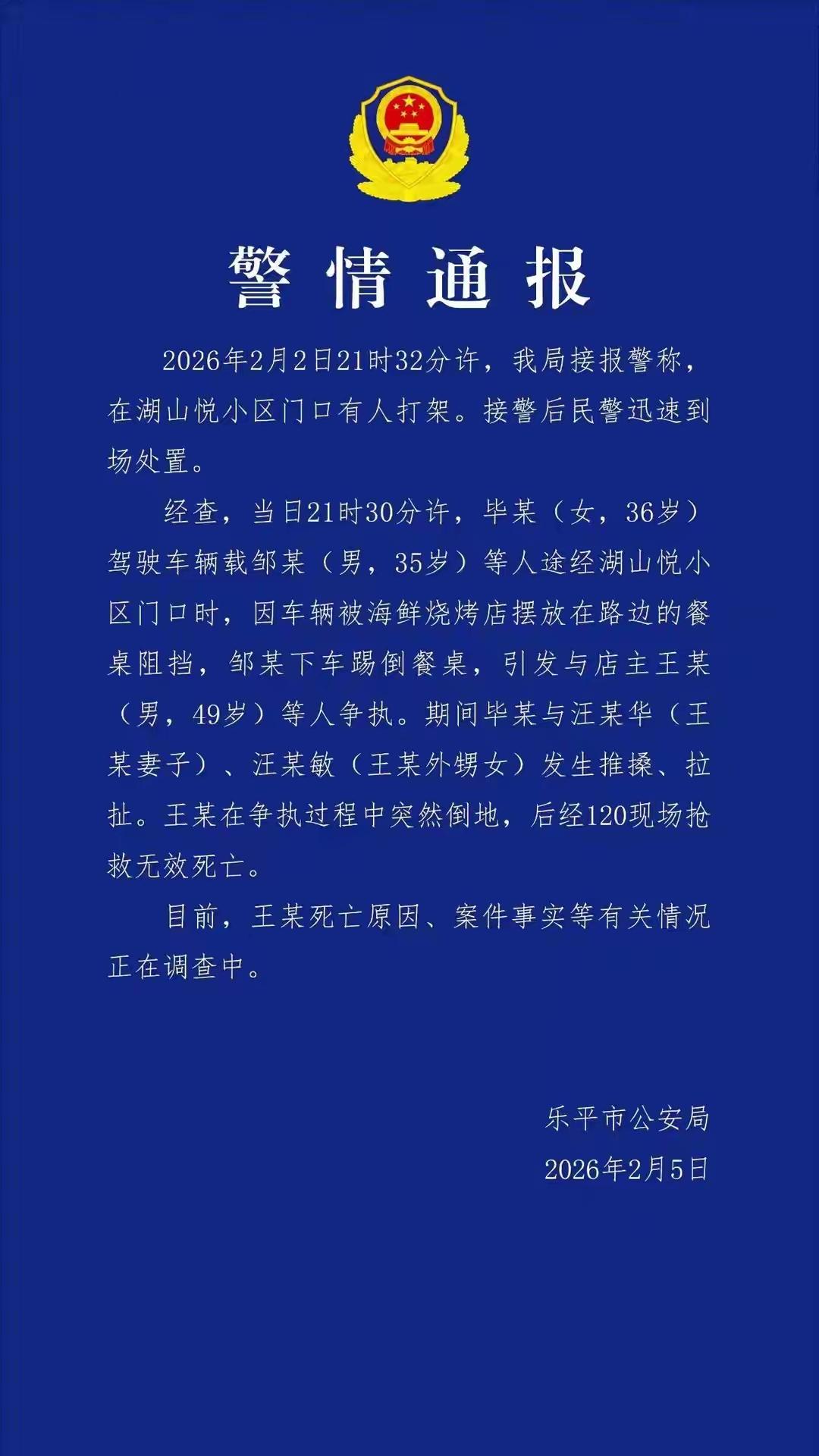 “冲动是魔鬼!”现实版,几句话就能解决的事,非得闹出人命!2月2日晚,江西乐平一烧烤店老板与驾车路过的司乘人员发生冲突,扭打过程中身亡。事件曝光后,引发社会关注。2月5日,江西乐平警方通报,事件起因是车上乘员踢到餐桌引发。事发后涉事人员已被警方控制。死亡原因、案件事实等有关情况正在调查中。 评:江西乐平烧烤店老板因口角冲突身亡,一场本可避免的摩擦,瞬间酿成夺命悲剧。只因餐桌挡路,一言不合便踢桌、推搡、扭打,情绪失控之下,法律底线被抛诸脑后。一条生命戛然而止,两个家庭瞬间破碎,代价何其沉重。小事不忍,大祸立至。遇事不冷静、动辄诉诸暴力,既是对他人生命的漠视,也是对自身自由的透支。公共空间需守规则,人际矛盾当讲理性。暴力从不是解决问题的方式,只会带来无法挽回的后果。愿逝者安息,更愿警钟长鸣:退一步海阔天空,守法律方得平安。社会热点 警方通报江西乐平一烧烤店老板身亡事件