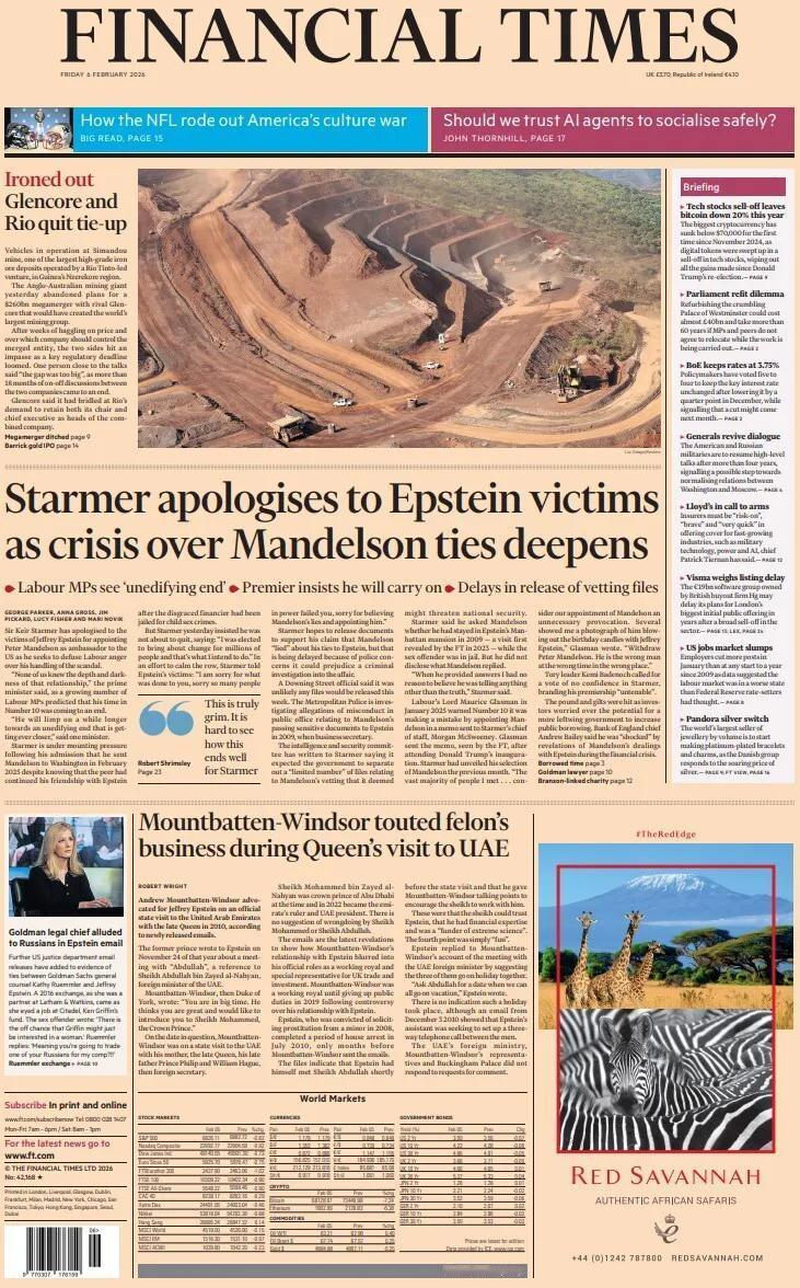 《金融时报》报道了世界矿产巨头嘉能可和力拓放弃合作 。 照片显示,在几内亚纳雷克雷地区,由力拓牵头的合资企业运营的最大高品位铁矿石矿床之一的西芒杜矿场中正在运行的车辆。 这家英澳矿业巨头昨日放弃了与竞争对手嘉能可进行2600亿美元巨型合并的计划,这笔合并本可打造出全球最大的矿业集团。 经过数周在价格以及由哪家公司控制合并后实体问题上的讨价还价,随着一个关键监管期限逼近,双方陷入僵局。 一位接近谈判的人士称“分歧太大”,两家公司超过15个月断断续续的讨论就此结束。 嘉能可说,它对必和必拓要求保留其董事长兼首席执行官作为合并后公司负责人的要求感到不满,有史以来最大的巨型合并计划搁置 。 另外该报关注了,首相基尔·斯塔默爵士向性犯罪富商杰弗里·爱泼斯坦受害者道歉的报道。 报道还报道,安德鲁·蒙巴顿-温莎(安德鲁王子)在与已故女王一同对阿联酋进行国事访问期间,推广了爱泼斯坦的利益。 蒙巴顿-温莎先生坚决否认与爱泼斯坦的友谊有任何不当行为。