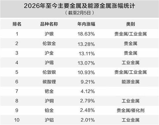 一段时间以来,有色金属市场涨幅亮眼。2025年全年,伦敦金涨幅高达65%。2026年涨势延续,截至2月5日证券时报记者发稿时,该品种年内涨幅为近14%;伦敦银去年累计上涨148%,今年以来累计涨幅也达到了超10%;号称“大宗商品之王”的铜同样涨势如虹,伦敦铜去年累计上涨43%,今年涨幅接近4%。此外,其他金属品种也都实现了不同幅度的上涨。