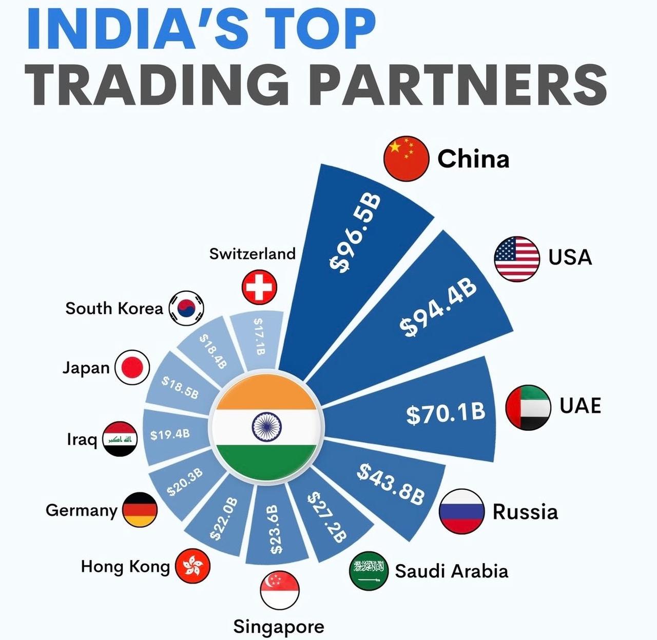 印度2025年贸易伙伴排名: 1、中国965亿美元; 2、美国944亿美元; 3、阿联酋701亿美元; 4、俄罗斯438亿美元; 5、沙特 272亿美元; 6、新加坡236亿美元; 7、香港220亿美元; 8、德国203亿美元; 9、瑞士171亿美元; 10、伊拉克194亿美元; 这是2月2日发布的数据,感觉是不是不对? 博主记得往年中印之间的贸易金额,都会超过1000亿美元,怎么2025年的贸易金额,是不是有所后退,这个不太确定。而且这一份数据,到底是不是完全统计出来的双边贸易数据,博主不能准确回答。因为通过各种搜索和一些媒体的数据,得来的消息,也是2月2日发布的最新版,应该是具有相当大的权威。 也可以看到印度和美国的贸易额,正在连年提高,这也是达成印美贸易协定的关键根本,确实双边贸易额也得到了提高。至于印度和阿联酋、新加坡、香港等地区的贸易数据,也能达到这么高,确实也是多不多见,这说明印度的贸易水平还不错。但是其中最多的就是印度和俄罗斯的贸易,主要是石油和天然气贸易。 俄罗斯出口印度的原材料,然后印度加工以后,转卖欧美西方,印度的贸易额数据,也是在连年提高。毕竟印度这样的一个大的国家,虽然有时候毛毛躁躁,但总体来说,还是保持了正向增长。 印度与咱们中国的贸易,主要是进口,而印度出口的中国的货物比较少,因为印度没有咱们需要的一些产。在工业制成品和其他产品上,都在国内得不到更多的需求,印度就光靠卖印度咖喱和印度神油,那才值几个钱? 印度的仿制药能卖的不少,但是具体贸易额,也不清楚。其余印度的工业品,我们这边几乎是不怎么要的,这就是贸易的数据。