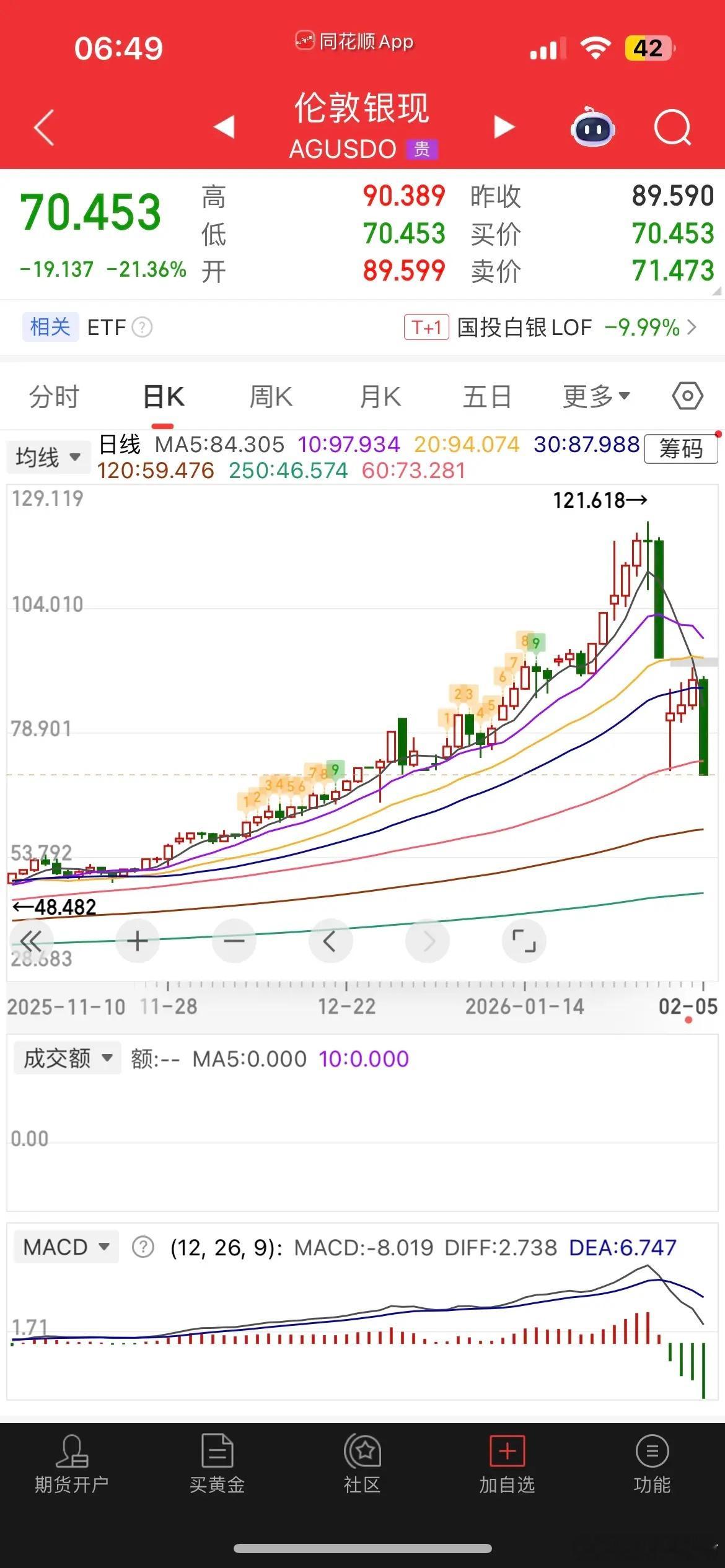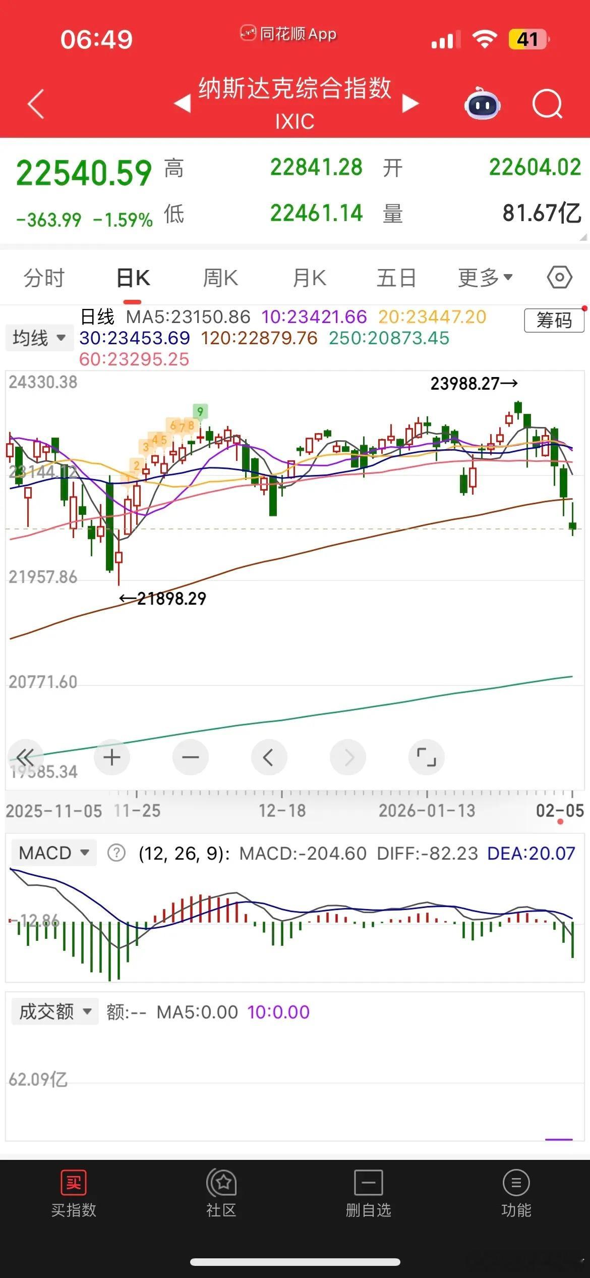 一觉醒来,美股重挫,贵金属崩了,现货黄金大跌超4%,跌破4800美元,白银暴跌21%,失守71美元,纳指金龙指数冲高回落,涨近1%,中概股涨跌不一,阿里、京东跌近1%,百度涨近1%,哔哩涨1.5%,拼多多跌0.6%,小鹏汽车涨0.66%,阿特斯太阳能大跌超8%,富时A50跌0.68%,恒生主连跌1.38%,这样看今天我们大A依旧会延续低开,不过低开高走概率大,而港股恒科估计又得低开1个多点。