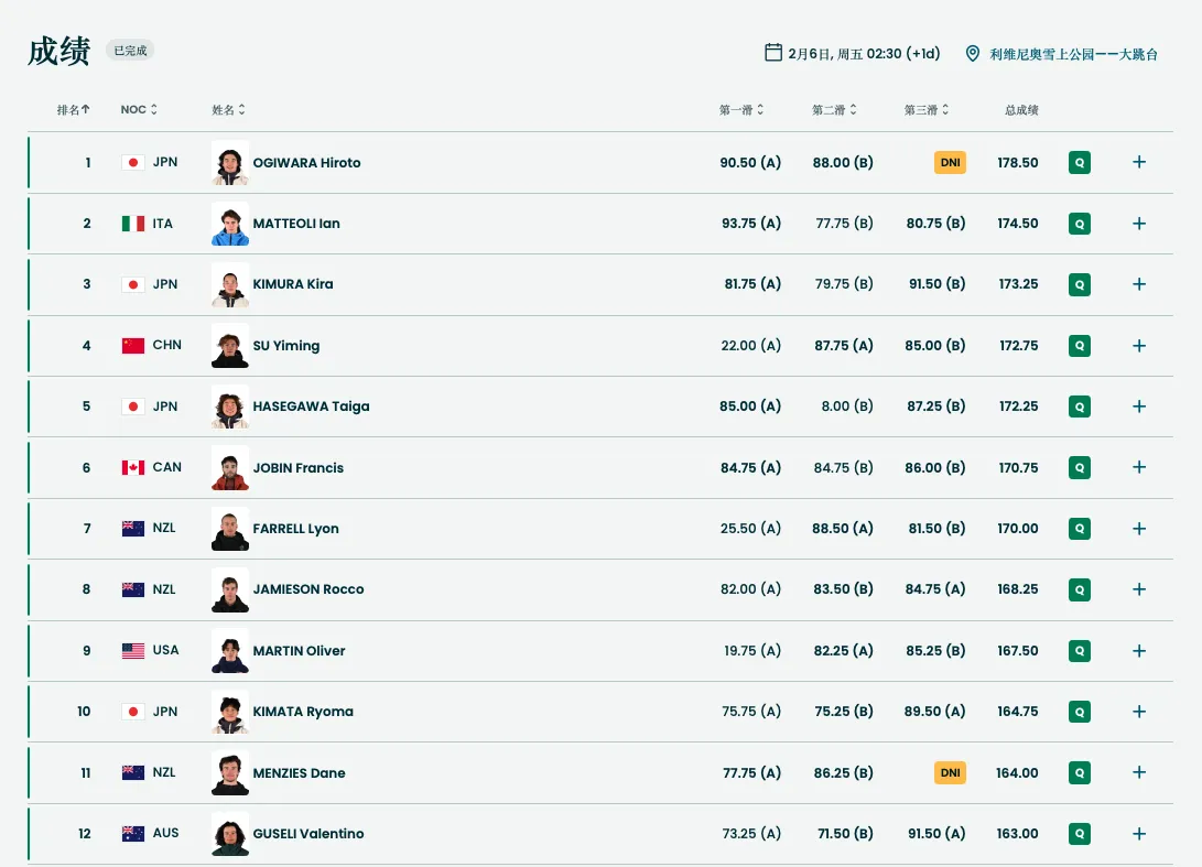 日本选手荻原大翔以总分178.50排名预赛第一,意大利选手马泰奥利总分174.50排名第二,另一位日本选手木村葵来总分173.25分排名第三。