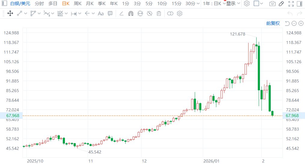 格隆汇2月6日|继前一交易日暴跌近20%后,现货白银价格今日延续跌势。在市场经历历史性抛售潮后,白银仍难以寻获支撑,现货黄金跌幅相对较小,现跌0.8%。现货白银早盘跌破70美元关口,最低下探至67美元下方,较1月29日创下的历史高点回落逾40%。截至周四收盘,白银已回吐今年全部涨幅,市场陷入自1980年以来未见的剧烈动荡。现货铂钯日内均跌超1%。