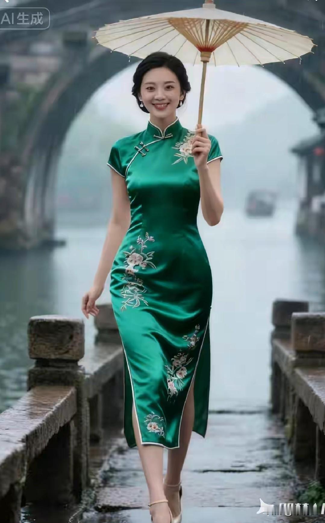 浅笑嫣然百媚生, 绿色旗袍衬娇容。 眉似春山寒远黛, 眸若秋水映繁星。
