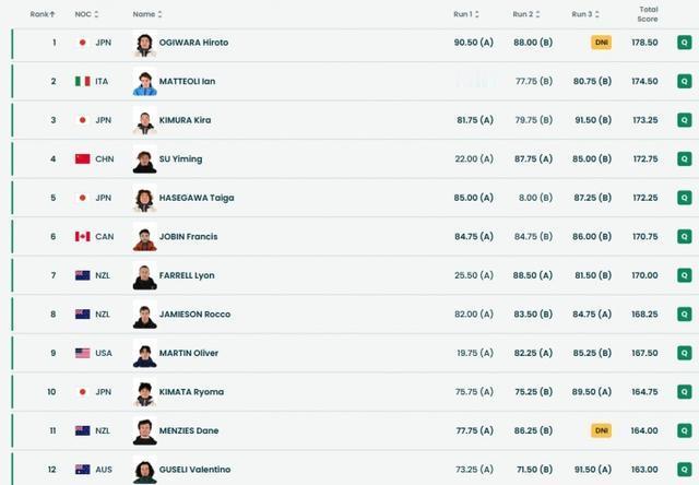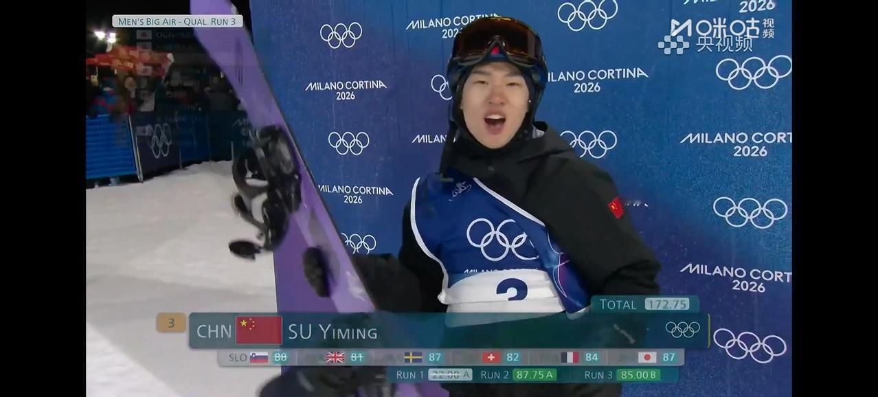 苏翊鸣惊险晋级!作为米兰冬奥会中国代表团首位亮相的明星选手,同时也是卫冕冠军,苏翊鸣在资格赛首跳出现失误,局面一度非常危险。幸亏最后两跳还是发挥出色排名第4顺利晋级决赛。另外两名中国选手杨文龙和葛春宇遗憾出局。但是从晋级名单来看,决赛苏翊鸣想卫冕难度还是不小。决赛有4名日本选手,还有1名东道主意大利选手。希望决赛小栓子能够卫冕成功,为中国代表团取得本届冬奥会首金吧,加油💪