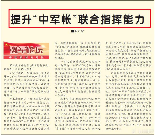 今天《解放军报》文章中写到:一体化联合作战成为现代战争的主要形态,“中军帐”成为联合作战指挥机构,这对每名指挥员的战略思维、信息素养、应对能力、谋划水平都提出更高要求。“中军帐”内,人人都应是强固节点,都要能独当一面,决不能有“滥竽充数”的现象,否则就会对“中军帐”的整体指挥能力造成影响,成为制约部队能打仗、打胜仗的一个短板。这让人想到2014年“大军改”之前,军队自曝问题中的“两个能力不够”和“五不会”。