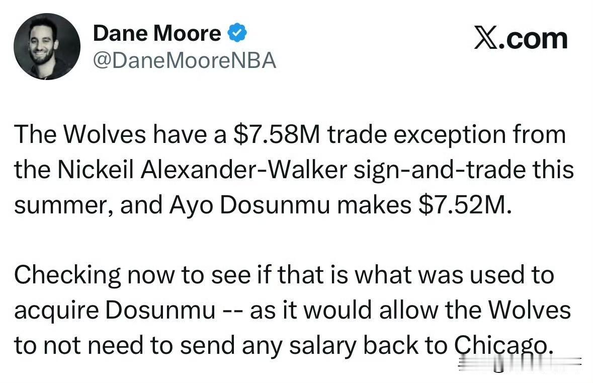 公牛和森林狼完成二换二!!!森林狼得到多森姆,公牛得到四个次轮! 根据记者Shams最新消息透露,芝加哥公牛队又行动了,他们将后卫阿约-多孙姆和菲利普斯交易至明尼苏达森林狼队,换回什么迪林厄姆、伦纳德-米勒以及四个次轮签。 公牛和森林狼又合作了,前两天森林狼刚把老将康利送到了公牛,如今又从公牛交易回来一个多森姆,相当于老将换年轻球员了,不过搭上了不少选秀权。 公牛之前有意和步行者讨论多森姆换马瑟林的交易方案,不过最终没有达成,森林狼在交易字母哥无望后也迅速改变策略。 多森姆是750万的到期合同,他可以在今夏6月30号以前签约最长3年合同,米勒下个赛季是球队选项,合同金额不高只有240万美元,而迪林厄姆的新秀合同还剩有三年,每年薪资分别为660万、690万美元以及880万美元(球队选项)。 森林狼也是把次轮拼了,花了四个次轮,太疯狂了,在这次交易完成之后,他们只剩下两个次轮签了。字母哥 森林狼