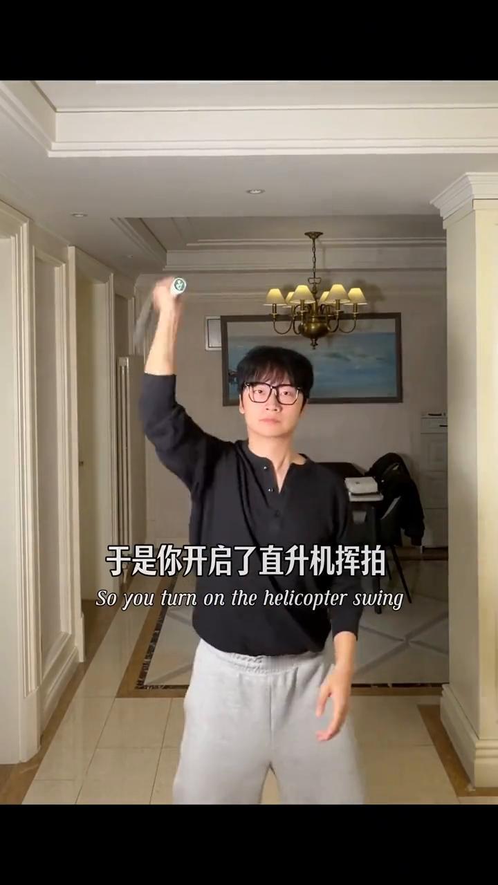 内旋发力挥拍,一分钟学会。 这是一个错误的击球。刚打球的你为了方便打到球,选择了拍面朝前挥拍,这样打出去的球没有力量。聪明的你选择了反复观看大力橙的视频,于是学会了用握手的方式握拍。但是你发现这样容易切拍或者打不到球,于是你又想到了可以在家通过击掌的方式来练习拍面转正。于是聪明的你很快学会了内旋击球。 聪明的你还想到,如果要提高击球球速与力量,必须通过提升手指手腕的力量。于是你开启了直升机挥拍,通过放松到抓紧,将力量稳稳地传导到了球拍。恭喜你学会了羽毛球鞭打发力。