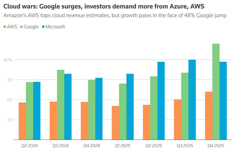 相比之下,亚马逊的竞争对手谷歌云(GOOGL.US)和微软(MSFT.US)Azure在去年第四季度的销售额分别增长了48%和39%。