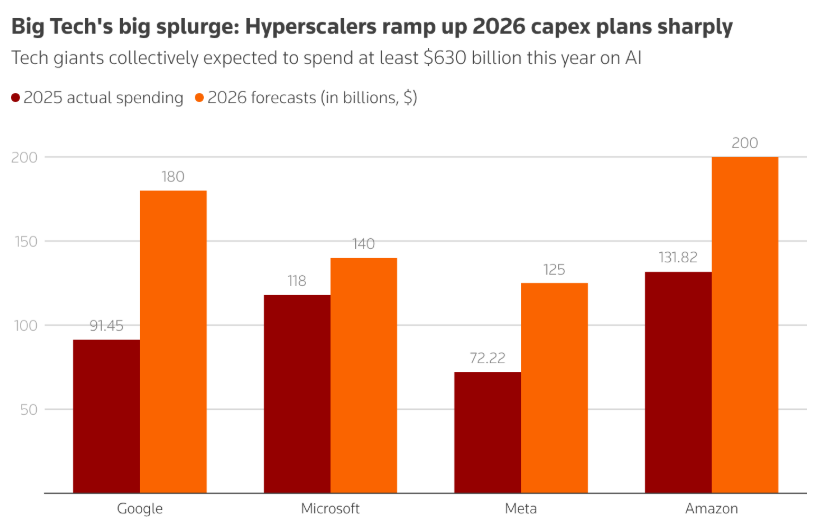 谷歌母公司Alphabet周三表示,预计2026年支出将在1750亿美元至1850亿美元之间,而Meta(META.US)表示,其资本支出可能比去年翻一番,达到1150亿美元至1350亿美元。