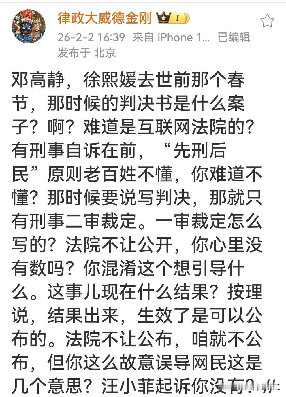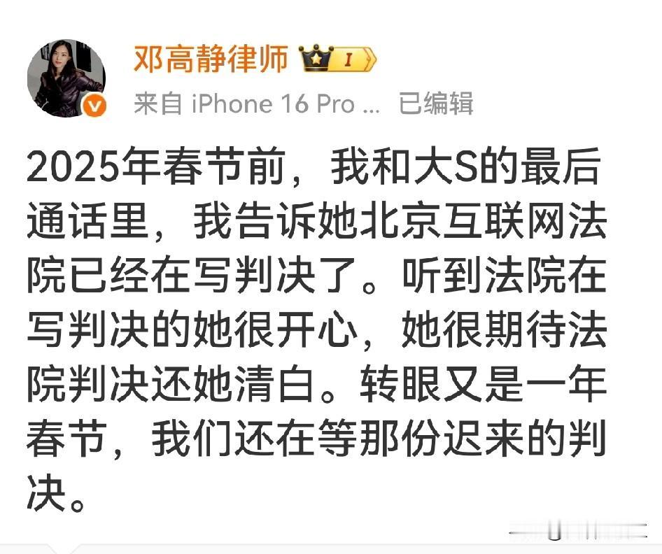 大S的律师邓高静在玩文字游戏?律师莉姐发出质疑! 大S的律师邓高静在微博发文:2025年春节前,我和大S的最后通话里,我告诉她北京互联网法院已经在写判决了。听到法院在写判决的她很开心,她很期待法院判决还她清白。转眼又是一年春节,我们还在等那份迟来的判决。 邓高静的这段文字传递出两个信息,一,大S提告张兰的案子长时间没出结果。 邓高静在质疑主审法官?大S已经起诉了,出不出结果不是张兰的问题,是主审法官说了算。既然有疑问,作为当事人的律师,她为什么不直接去问主审法官?为什么要发到网上?网民能给她出判决结果?除了能引导舆论,发到网上还能起什么作用? 二,邓高静在暗示大S是清白的,所以才会“很开心、很期待”,只有能赢官司的人才会有这种心情……大S起诉张兰的案子真的久拖不决吗? 对此,张兰的朋友律师莉姐紧跟着发了一篇博文,说邓高静在玩文字游戏,问邓高静:一审裁定怎么写的?法院不让公开,你心里没数吗?你混淆这个想引导什么?按理说,结果出来,生效了,是可以公布的,法院不让公布,咱就不公布,但你这么故意误导网民是几个意思? 通过两位律师的对话可以看出来,这个官司已经有了“一审裁决书”,因为“裁定”不等于“判决”,邓高静才会说“一直在等判决”。 “裁定”管程序问题(能不能立案、驳回起诉、保全、撤诉、上诉驳回等),不判谁对谁错、不判赔钱/责任。“判决”管实体问题(谁输谁赢、赔多少钱、是否侵权、是否违约),是案件最终结果 。该案多为程序性裁定(如驳回起诉、驳回上诉、管辖权异议、保全等),不是对案件实体权利义务的终局判决 …… 简单说:裁定是“走流程”,判决是“定输赢”。 邓高静故意不提“一审一审裁定”,只说“我们还在等那份迟来的判决”,无疑是在玩文字游戏,并借机误导大众。 作为律师,邓高静为什么要这样做?你们更相信哪位律师?