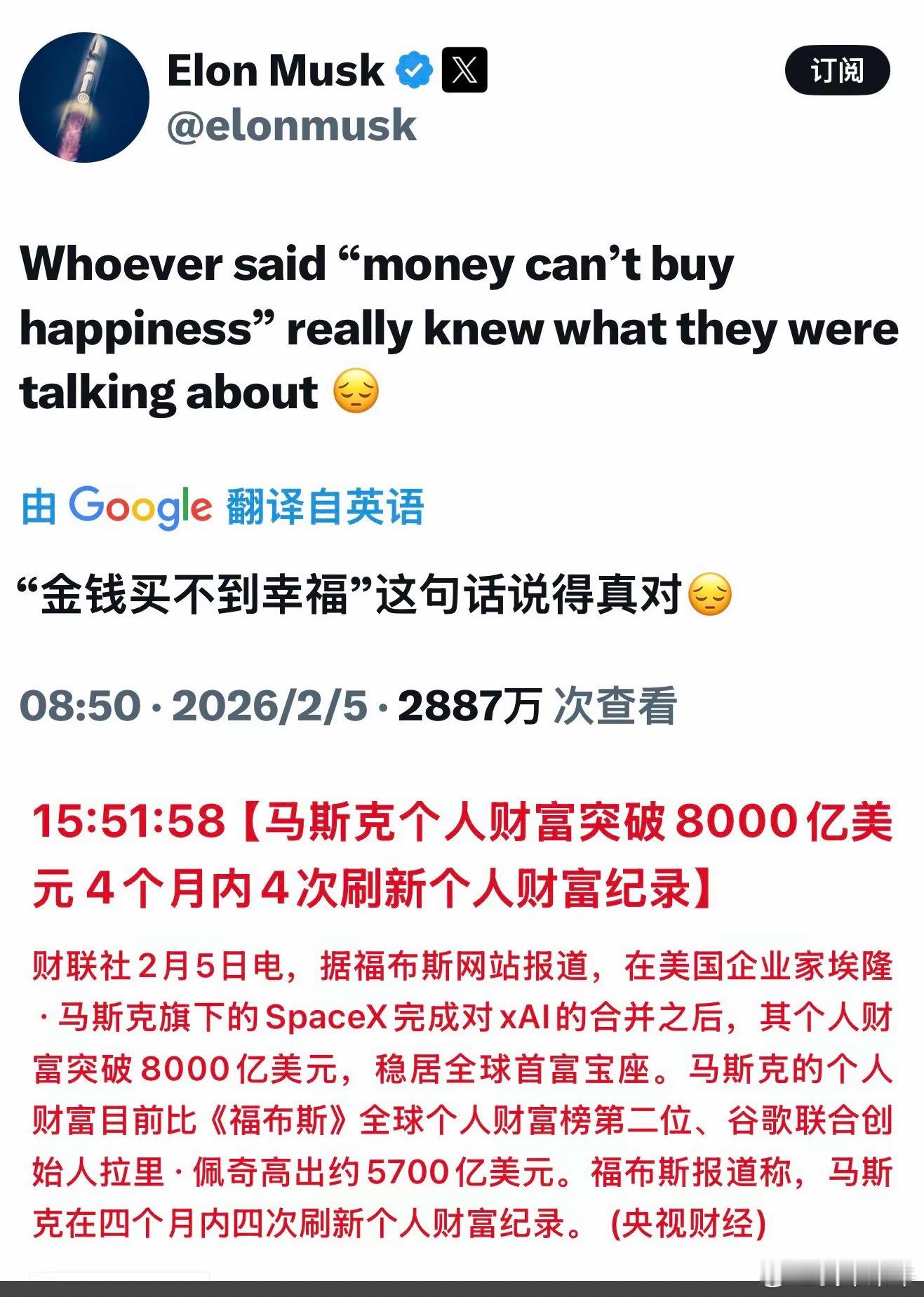 马斯克说有钱也买不到幸福这句话很对,但没钱更不幸福。他的评论下面有人说,给我100万美元,我要体验下你的不幸福我怀疑海后在床上拉屎,也是马斯克教的……毕竟边际效益递减,他确实过了钱能给快乐的极限了,要刺激……