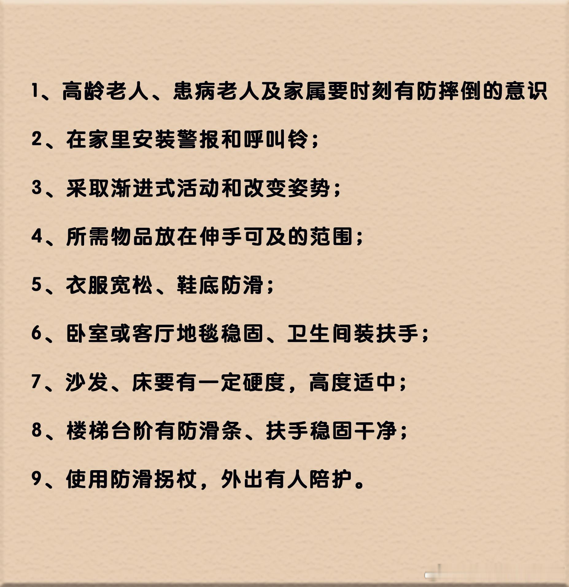 这种情况又特别容易发生在冬季,很多老人都是在冬天摔了一跤,就没能熬过去。 髋部骨折不容易愈合,而且因为传统观念和手术指标,很多人选择保守治疗,然而长期的卧床静养很容易引发褥疮、肺部感染、血栓等一系列并发症,风险极高⚠️ 比起治疗更有效的是预防,对于骨质疏松,人体骨量的存储是在年轻的时候就开始的,在30岁左右达到峰值,之后就一直走下坡路,处于慢慢流逝状态。 ——饮食要均衡摄入,在此基础上,多摄入钙和维生素D,多晒太阳,多进行力量训练,多进行室外的体育锻炼。 ——如果已经骨质疏松,还需要加入药物的帮助。比如钙剂、维生素D剂、降钙素,年纪大的女性可以补充雌性激素和异黄酮。 ——除此之外,氟化物、合成类固醇和甲状旁腺激素也可以使用。在饮食上,一般人群每天摄入800-1000mg钙,老人每日钙摄入量可提高至1200mg,同时需要避免过多的钙摄入。 ——在运动方面,可以做一些脊柱稳定性的训练,避免在摔倒后造成压缩性骨折,比如:坐姿稳定训练、瑜伽球上的平衡训练。对于下肢,可以进行一些浅蹲训练,预防摔倒后股骨颈骨折,包括下肢平衡训练。 值得注意的是,因为已经存在骨质疏松,在运动时就需要格外注意避免跌倒,避免力量训练负重超过自身能力。 如果是比较严重骨质疏松的老人,还是不建议进行运动训练,应该更侧重于防跌倒的平衡训练。比如,平衡垫上的一些练习。 👉另外还有生活中的一些防跌倒的细节:1、物品放在伸手可及的范围;2、衣服宽松、鞋底防滑;3、室内的地毯稳固,尤其卫生间地板要防滑,装扶手;4、楼梯台阶有防滑条、扶手稳固干净;5、使用防滑拐杖。运动康复