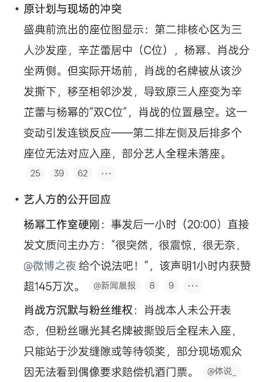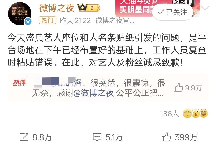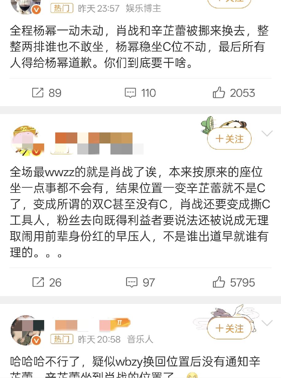 肖战粉丝骂🉐也太狠毒了吧,还是红V大粉? 吃瓜了一晚上,也没看出来杨幂错在哪儿了? 粉丝说是杨幂把肖战的名牌撕下来,贴到隔壁桌的,有视频或者照片吗? 我觉得杨幂做不出这么愚蠢的事情吧? 微博的解释,意思不是工作人员撕的?为什么肖战粉丝要骂杨幂呢? 不过,肖战也确实无辜,因为微博的失误,一晚上都没🈶落座,关键他的奖还特别靠后才颁发。 微博确实应该给肖战道歉,但是肖战的大粉也确实不该辱骂杨幂。