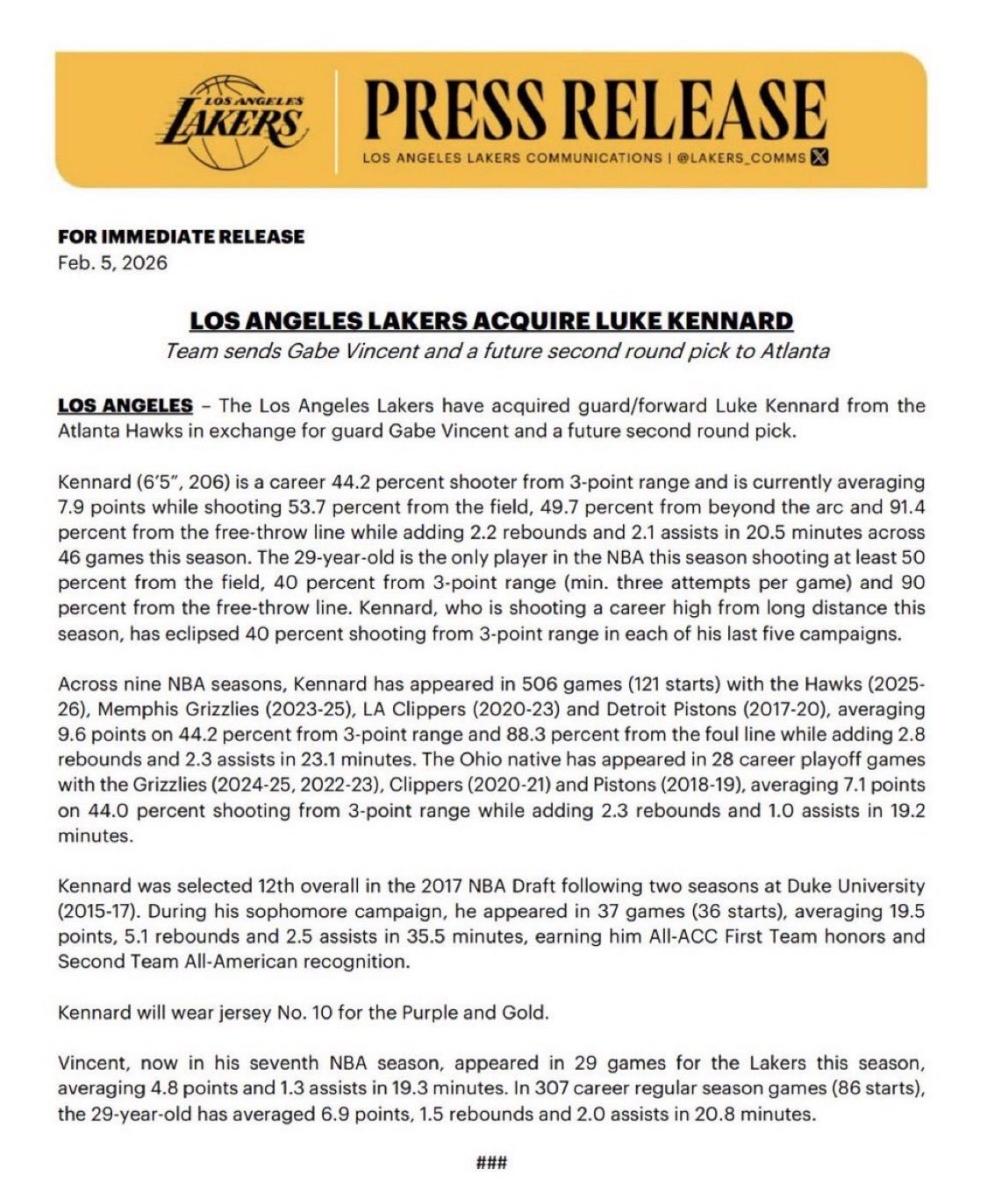 湖人队正式宣布签下卢克·肯纳德。他将为紫金军团身披10号球衣。