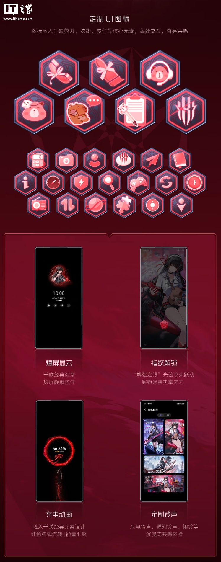 据介绍,这款红魔11Pro+鸣潮限定版以“共鸣者・千咲”为设计原点,将其标志性的技能元素化身为视觉核心,令弦线交织于红色透明背板上,同时机身复刻了千咲经典黑红配色。在系统方面引入了联名定制千咲主题,包括图标/熄屏显示/铃声/充电动画均进行了定制处理。