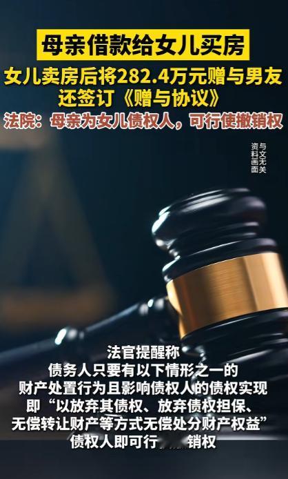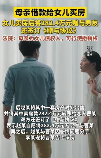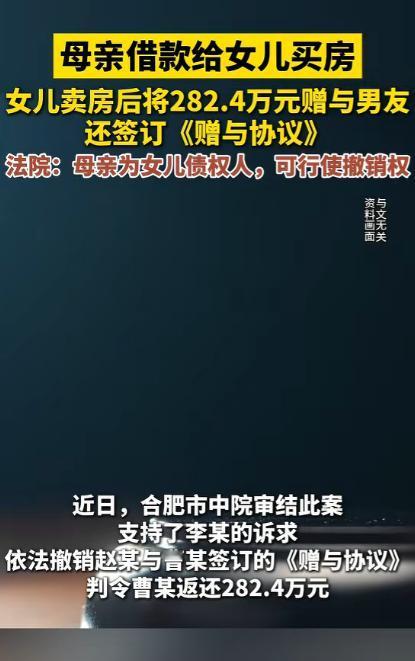 “恋爱脑害人!”安徽,一母亲花403万买了2套房,均登记在女儿名下,谁知,女儿竟瞒着母亲,偷偷将房子卖了,并拿出282.4万元无偿赠与男友,不料,2人没多久就分手了,母亲知道真相后果断起诉对方,并要求对方返还那282.4万元钱,法院判了! 最近安徽的一起民事纠纷案件在网上引发了不少人的关注,一位母亲倾尽半生积蓄给女儿置办房产,本是为了给女儿的未来添一份保障。 却没想到女儿会瞒着自己处置房产,还将大额卖房款无偿赠与男友,最后落得人财两空的境地。 安徽的李阿姨花了403万元,给女儿赵莹(化名)买两套房产,两套房子全都登记在了女儿的名下。 在转账支付购房款的当天,李阿姨让女儿给自己出具了两张欠条,白纸黑字写清楚了这 403 万元是女儿向自己借款用于购房,女儿当时没多想就签了字。 在她看来,母女之间谈钱太见外,这两张欠条不过是让母亲安心的形式而已,却没想到这几张纸会成为日后挽回损失的关键依据。 2022 年中旬,赵莹经人介绍认识了曹军(化名),两人迅速坠入爱河,陷入热恋的赵莹满心满眼都是男友,对母亲的关心也渐渐变得敷衍。 曹军平日里总在赵莹面前抱怨,说自己在合肥打拼多年,工资除去日常开销根本攒不下多少,眼看年纪越来越大,连买房的首付都凑不齐,连个安稳的家都没有。 说者有意听者更有心,赵莹看着母亲给自己买的两套房子,心里突然冒出一个想法,她觉得卖掉一套房帮男友凑齐房款,两人就能早点谈婚论嫁,这份付出肯定能让彼此的感情更牢固。 于是在 2023 年上半年,赵莹完全没和母亲沟通,私下联系了房产中介,把经开区那套 305 万购入的房子挂了出去,没多久就收到了房款。 拿到钱的赵莹丝毫没有犹豫,转头就通过银行转账,分三次给曹军转去了 282.4 万元,自己只留了二十多万用于日常开销。 为了让这份赠与显得 “名正言顺”,2023 年 9 月,赵莹还和曹军专门签订了一份书面的《无偿赠与协议》,协议里白纸黑字写着,赵莹自愿将 282.4 万元无偿赠与曹军,该款项专门用于曹军购置个人房产。 曹军在协议上签字确认后,拿着这笔钱在 2023 年 12 月,直接在合肥瑶海区全款买了一套商品房,并且将房屋产权单独登记在自己名下,从头到尾,他都没有过问这笔钱的来源,也从未和李阿姨有过任何沟通。 而这边的李阿姨对此事一无所知,依旧过着省吃俭用的日子,每天买菜挑便宜的买,衣服穿了好几年都舍不得换。 想着女儿名下有两套房产,往后的生活有了着落,自己的晚年也能踏实度过,却不知道自己的半生心血,早已被女儿当成了讨好男友的筹码。 变故发生在 2023 年 9 月底,赵莹和曹军因为生活琐事和三观不合,吵得不可开交,最终彻底分手。 情绪崩溃的赵莹哭着回了家,在李阿姨的反复追问下,才支支吾吾把偷偷卖房、无偿赠与男友 282.4 万元的事情和盘托出。 听到这个消息,李阿姨当时就气得浑身发抖,眼前一黑差点栽倒在地,缓过神来后,心疼、愤怒、失望种种情绪涌上心头,那可是她从牙缝里抠出来的养老钱啊! 冷静下来后,李阿姨第一时间联系曹军,希望对方能念及情分,把这笔钱返还回来,可曹军要么避而不见。 要么就拿出那份《无偿赠与协议》,理直气壮地表示,钱是赵莹自愿赠与的,有书面协议为证,自己没有任何返还的义务。 后来李阿姨找了居委会、派出所多次调解,曹军始终态度强硬,拒不配合,无奈之下李阿姨拿着女儿当初出具的两张欠条,一纸诉状将曹军告上了法庭。 诉求非常明确:依法撤销赵莹与曹军签订的《无偿赠与协议》,判令曹军全额返还 282.4 万元。 法院受理案件后,承办法官对案件细节进行了全面、细致的审查,最终判决撤销赵莹与曹军签订的《无偿赠与协议》,判令曹军在判决生效之日起十五日内,一次性向李阿姨返还 282.4 万元。 这起案件也为司法实践提供了明确的裁判指引,针对父母为子女出资购买房产,子女却擅自处置房产并将款项无偿赠与他人的情况,父母可基于债权人撤销权制度维护自身的合法权益。 在家庭的大额财产往来中,书面凭证的重要性也在这起案件中体现得淋漓尽致,清晰的约定和凭证,才能在纠纷发生时,成为维护自身权益的有力依据。 对于这件事,您有什么想说的吗?欢迎评论区留言讨论。 信源:广州日报2026-02-02——《母亲借款给女儿买房,女儿卖房后将282.4万元赠与男友,还签订《赠与协议》,法院:母亲为女儿债权……》