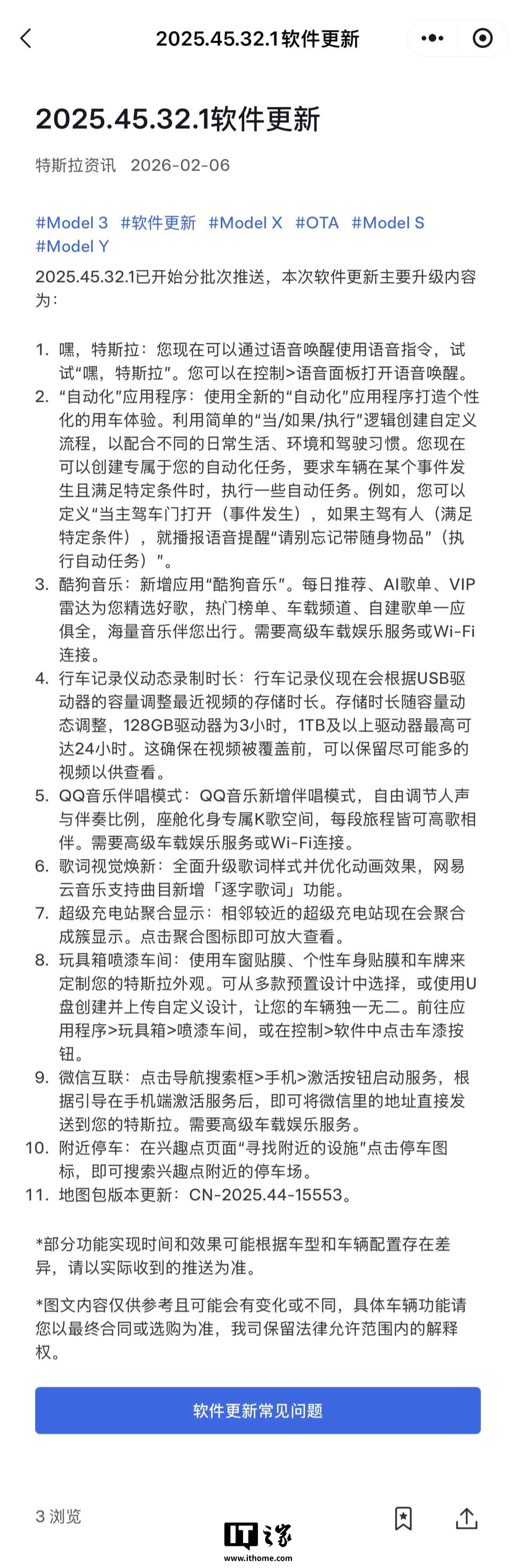 IT之家2月6日消息,特斯拉中国现已为旗下ModelS/3/X/Y车型推送2025.44.32.1软件更新,本次更新主要引入语音唤醒、“自动化”应用程序、酷狗音乐App,并改进QQ音乐、行车记录仪、歌词视觉等,同步将地图包版本更新至CN-2025.44-15553版本。