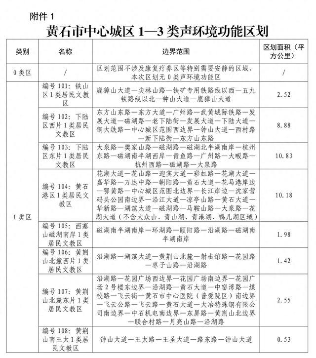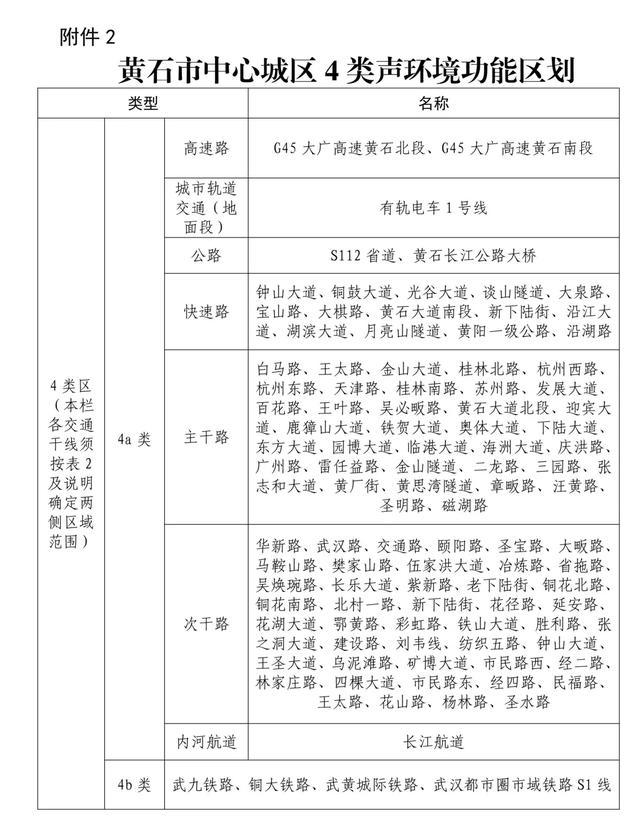 本次区划将黄石市中心城区划分为29个声环境区划单元。其中12个单元确定为1类标准适用区;12个单元确定为2类标准适用区;5个单元确定为3类标准适用区。此外,97条交通干道、1条内河航道、2条城市高速和1条城市轨道交通两侧一定距离内区域确定为4a类声环境功能区(4a类交通干线100条,总长度380.168公里,不含长江航道)。武九铁路、铜大铁路、武黄城际铁路、武汉都市圈市域铁路S1线等4条铁路两侧一定距离内区域确定为4b类声环境功能区。