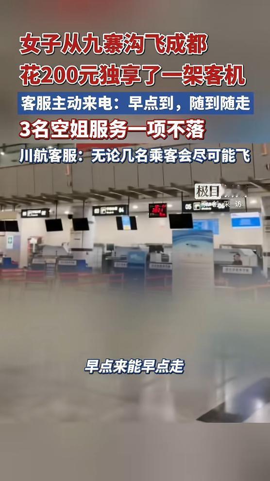 “开眼界了!”2月1日,四川九寨沟,一女子花200元买了张机票,起飞前接到机场电话,称这趟航班就她一名乘客,如果早点到就能早点走,更令她没想到的是,还有3名空姐为她一人服务,直接独享专机!网友:好想体验一把! 那天晚上她收拾好东西,匆匆赶往九寨黄龙机场,一路上还在琢磨,200块钱的机票,能顺利起飞就不错了,说不定还要排队等很久,毕竟便宜机票,体验感大概率好不到哪里去,可就在她赶往机场的路上,突然接到了航空公司的电话,这个电话直接让她懵了,也让后来知道这件事的我们,直呼开眼界了。 电话里工作人员告诉她,这趟回成都的航班,全程就只有她一名乘客还叮嘱她,如果能早点赶到机场,飞机就能早点起飞,不用再额外等待,一开始她还以为自己听错了,甚至怀疑是不是诈骗电话,反复确认了好几遍,才知道这是真的,自己居然一不小心,就成了这架民航客机的“唯一乘客”。 换做是我接到这样的电话,估计也会不敢相信,毕竟这种事,只在霸道总裁小说里见过,现实生活中,怎么可能有人花200块钱,就能独享一整架民航客机呢?这简直离谱到不行,说出去真的太开眼界了。 她赶紧加快速度赶到机场,办理登机手续、过安检,全程都特别顺利,没有一点拥挤,也没有一点等待,等到她推开机舱门的那一刻,眼前的一幕再次让她愣住了,整个机舱空荡荡的,看不到一个其他乘客,一排排座椅整整齐齐地摆着,安安静静的,没有平时坐飞机那种嘈杂的交谈声,也没有大家争抢行李架的混乱场面,安静得仿佛这架飞机是专门为她准备的。 后来她才知道,这趟航班是四川航空的3U6676次航班,是一架标准的民航客机,平时都是满员或者接近满员的状态,可那天偏偏只有她一个人买票登机,更让她没想到的是,就算只有她一名乘客,航空公司也没有偷工减料,安排了整整三名身着制服的空姐,专门为她一个人服务。 平时我们坐飞机,一名空姐要负责几十上百名乘客,能顾得上每个人就不错了,可这位女游客,却享受了“三对一”的专属服务,真的太让人羡慕了,也太开眼界了。 不管是安全演示、客舱广播,还是中途的巡舱服务,三名空姐都一丝不苟地完成,没有因为乘客少就敷衍了事,那种专属服务的仪式感,在空荡荡的万米高空,显得格外特别。 更离谱的是飞机还提前起飞了,这趟航班原定的起飞时间是21点30分,因为只有她一名乘客,不用等待其他旅客,也不用浪费多余的时间,飞机硬生生提前到了21点10分就起飞了,最后在21点55分,平稳降落在成都天府机场,比原定时间足足早了35分钟。 想想我们平时坐飞机,要么是在候机楼里无尽等待,要么是在跑道上排队滑行,能准时起飞就已经很满足了,更别说提前起飞,还提前半个多小时到达,这种效率对于习惯了等待的我们来说,简直奢侈到不敢想,也再一次让我觉得,这件事真的太开眼界了。 估计很多人都会和我一样疑惑,航空公司这是疯了吗?200块钱的票价,连飞机起飞时那一脚油门的燃油费零头都不够,明明取消航班就能止损,为什么还要亏本起飞,还安排三名空姐专门服务? 其实这背后,是航空公司的责任和温度。 九寨黄龙机场是一座旅游支线机场,距离九寨沟景区还有88公里,客流量受季节和日期的影响特别大,淡季的时候,客流量就会特别少,而且这趟3U6676次航班,在2月1日飞完之后,下一班要等到三天后的2月4日,如果航空公司为了省钱取消这趟航班,这位女游客就会被迫滞留在高原上整整三天。 在那个偏远的山区,住宿、交通都不方便,滞留三天的话,花费的钱和浪费的时间,都会给这位女游客带来很大的不便,所以在“亏本起飞”和“让游客滞留”之间,川航选择了前者,硬扛着亏损,也要保障这唯一一名乘客的行程,这份担当真的很让人感动。 这件事在网上传开之后,瞬间引发了热议,网友们都在转发这个“锦鲤”故事,纷纷表示“好想体验一把”,还有人晒出了自己在淡季旅游支线上遇到的类似“包机”经历,原来这种看似不计成本的飞行,并不是孤例。 说实话200元的机票,买到的不只是一个宽敞的座位和提前到达的便利,更是航空公司的责任和诚意,在这个凡事都讲利益、讲算计的时代,能看到航空公司愿意为了一个人的行程,启动一整架飞机和三名工作人员,这种笨拙又真诚的做法,比任何广告都更能打动人心。 (信息来源:《女子从九寨沟飞成都花200元独享了一架飞机,客服主动来电:早点到随到随走。川航客服:无论几名乘客会尽可能飞》极目新闻)