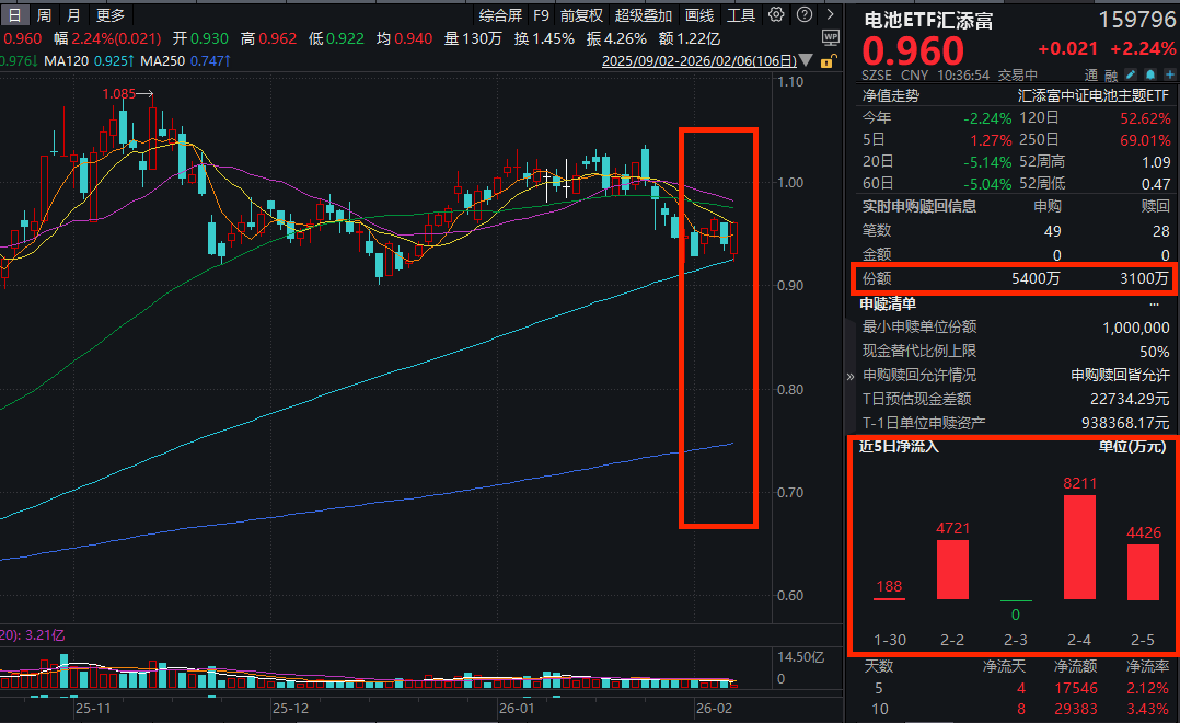 2月6日,A股市场探底回升翻红,电池板块再度反攻,同类规模领先的电池ETF汇添富(159796)涨超2%,盘中再获2300万份净申购,近5日更是“吸金”超1.7亿元,反映资金布局意愿!