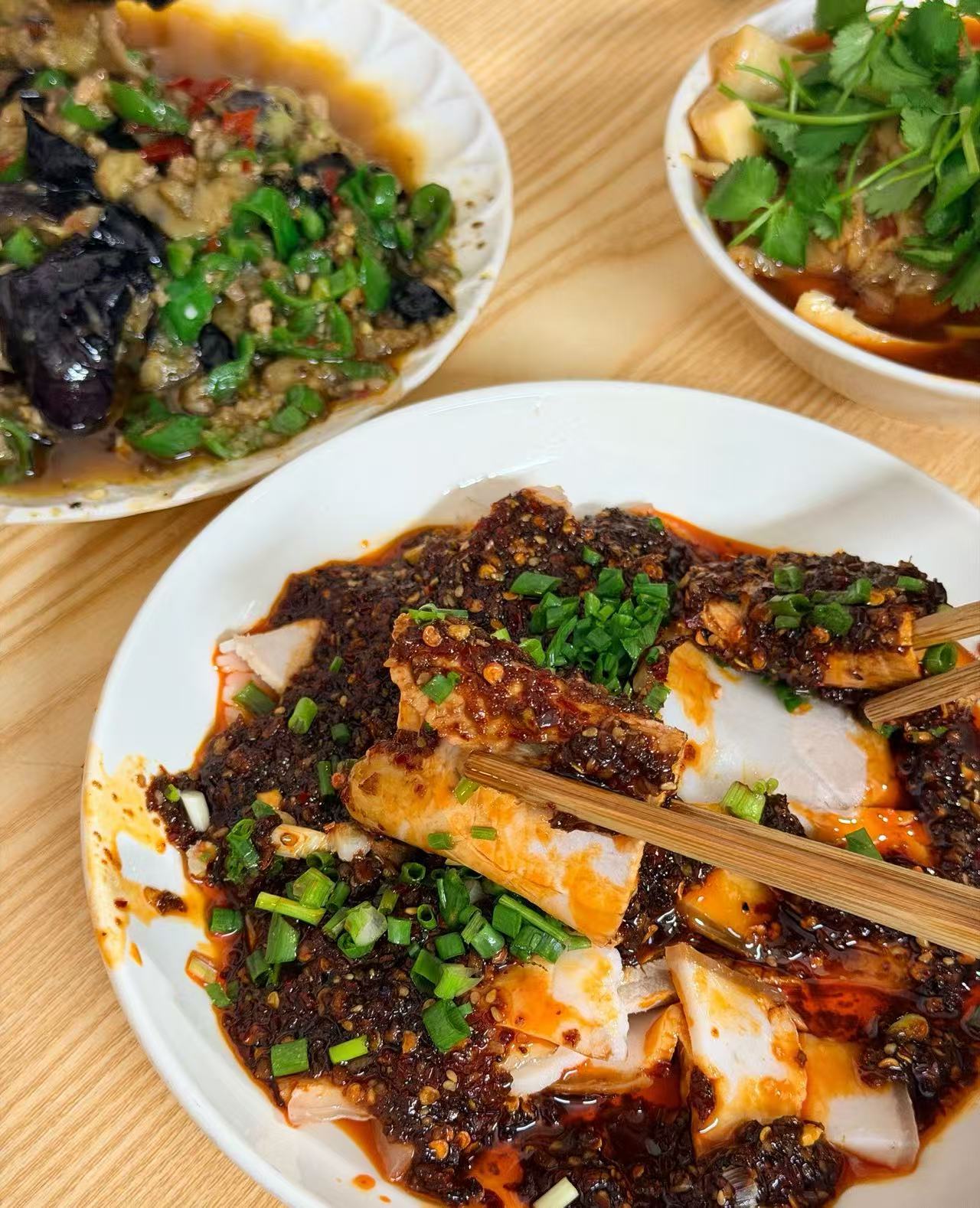 2️⃣.蒜泥白肉,二刀肉切得薄,煮得鲜嫩不柴,灵魂蒜泥酱料酸辣开胃