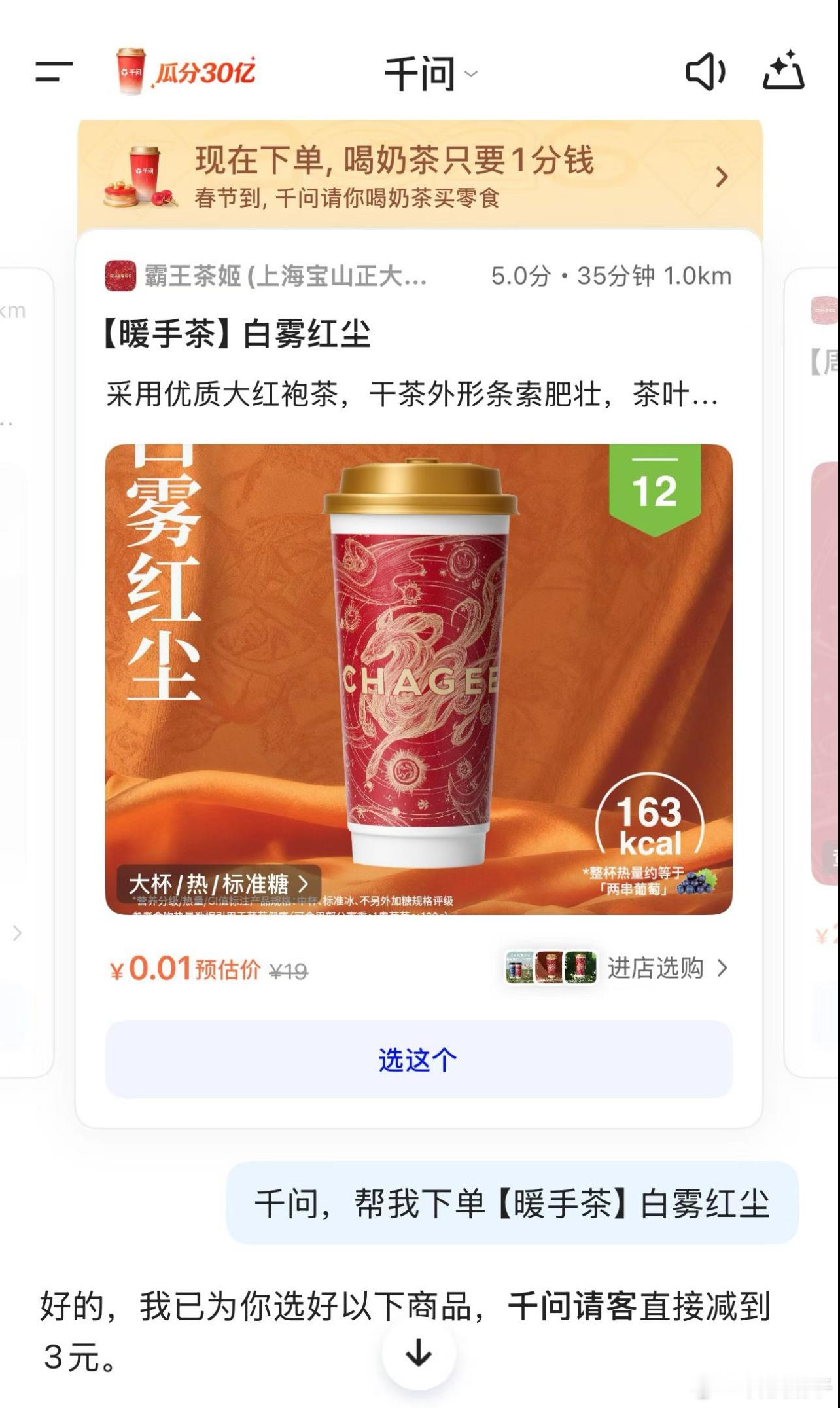 喜大普奔,千问花30亿请全国人吃喝玩乐啦,第一波就是奶茶免单,人人都能参与,过年喝奶茶的快乐直接拉满~